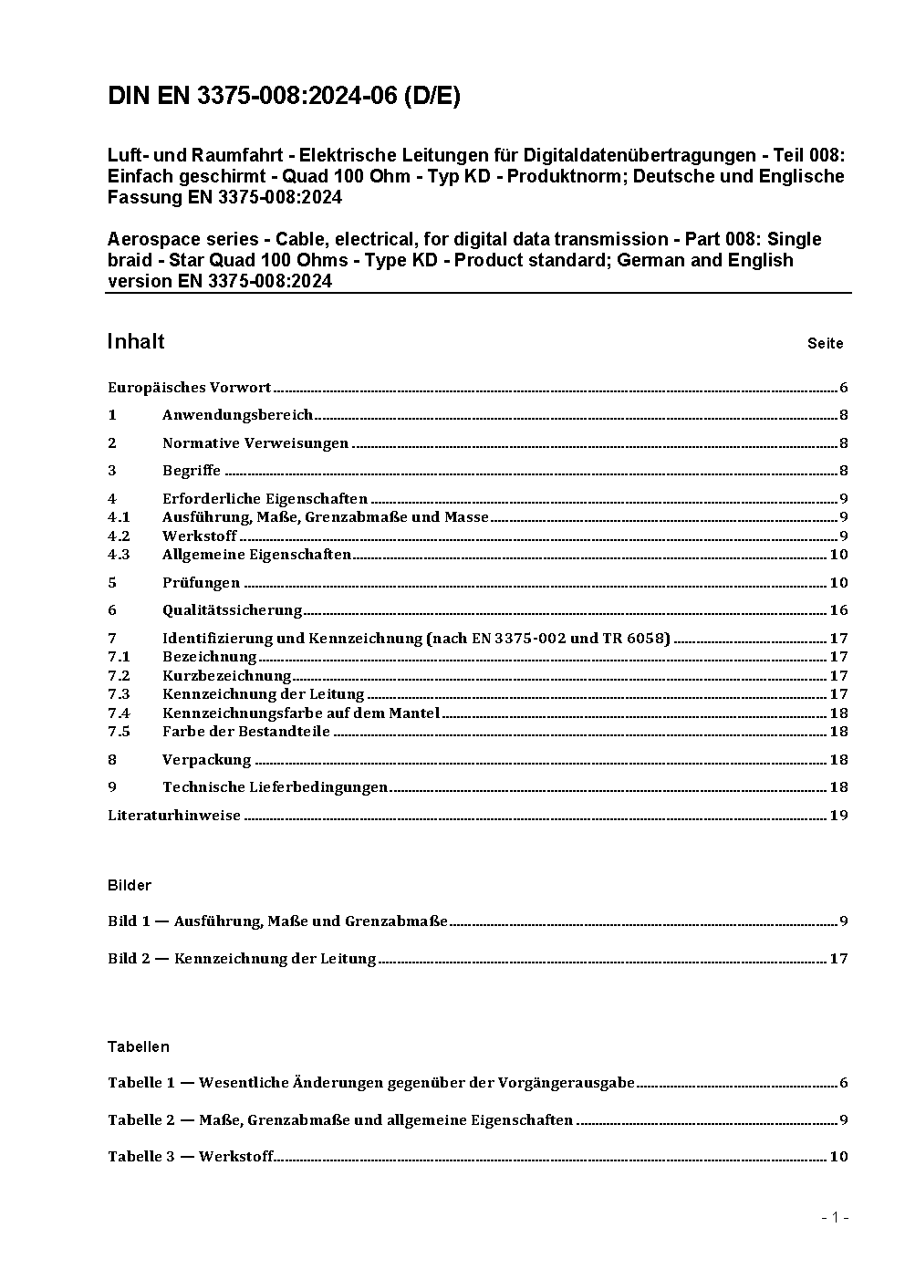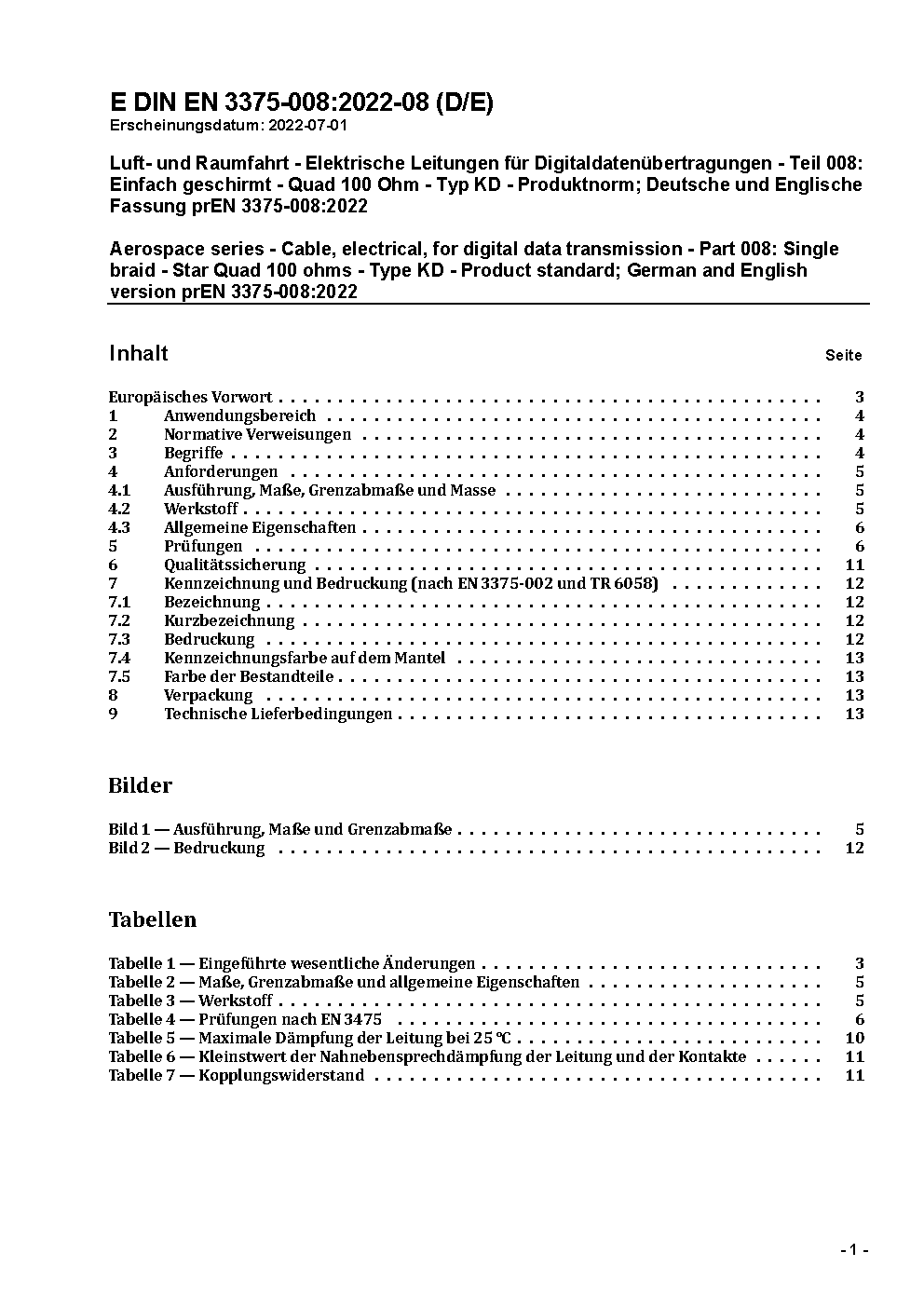 Luft- und Raumfahrt - Elektrische Leitungen für Digitaldatenübertragungen - Teil 008: Einfach geschirmt - Quad 100 Ohm - Typ KD - Produktnorm; Deutsche und Englische Fassung EN 3375-008:2009