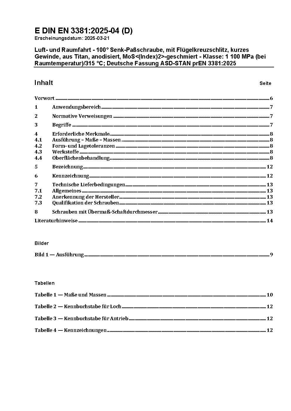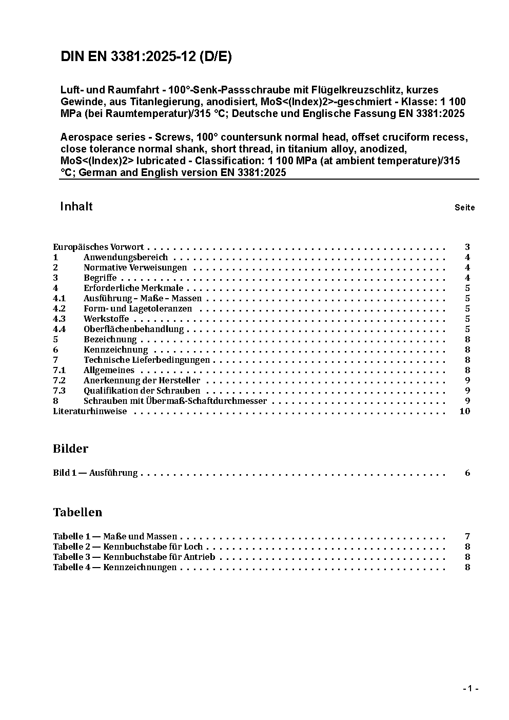 Luft- und Raumfahrt - 100° Senk-Paßschraube, mit Flügelkreuzschlitz, kurzes Gewinde, aus Titan, anodisiert, MoS<(Index)2>-geschmiert - Klasse: 1 100 MPa (bei Raumtemperatur)/315 °C; Deutsche Fassung ASD-STAN prEN 3381:2025