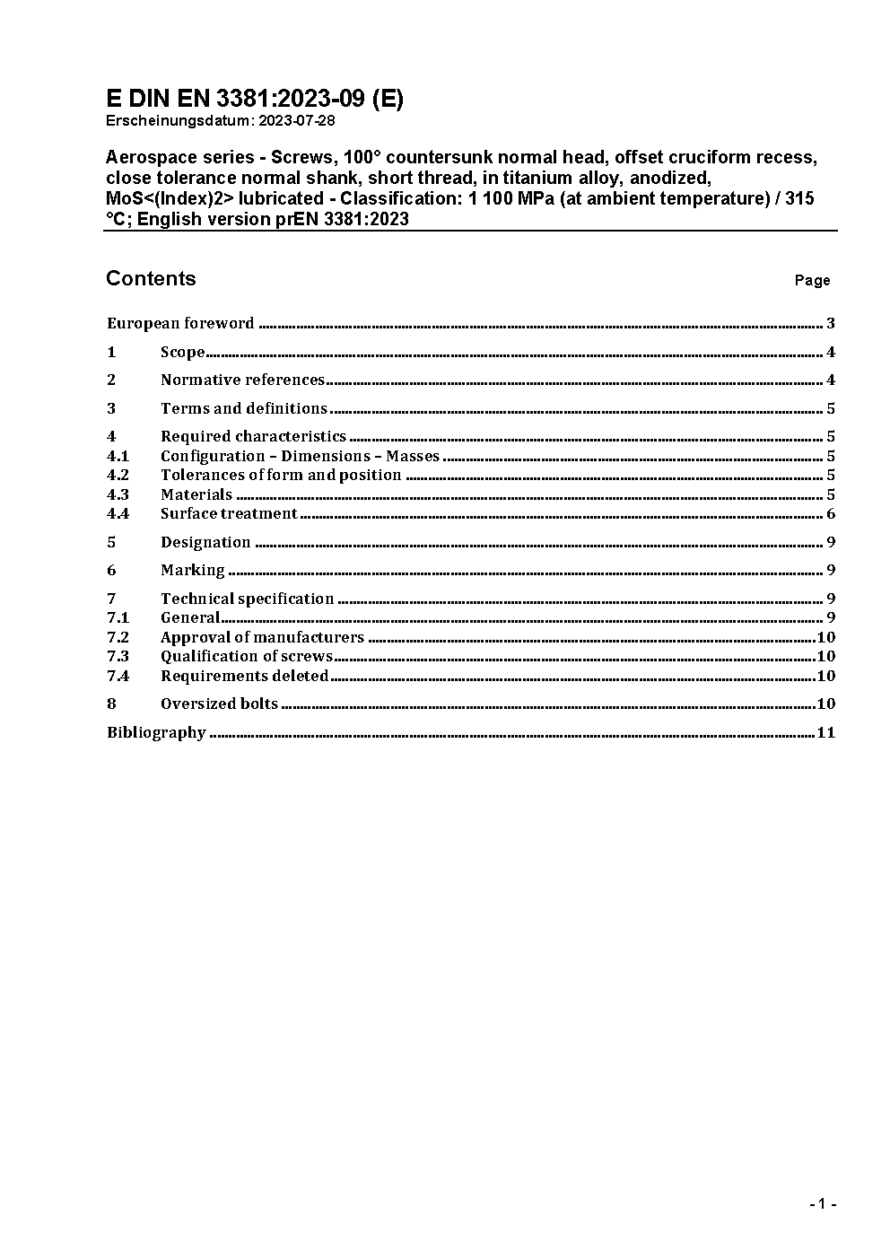 Aerospace series - Screws, 100° countersunk normal head, offset cruciform recess, close tolerance normal shank, short thread, in titanium alloy, anodized, MoS<(Index)2> lubricated - Classification: 1 100 MPa (at ambient temperature) / 315 °C; German version ASD-STAN prEN 3381:2025
