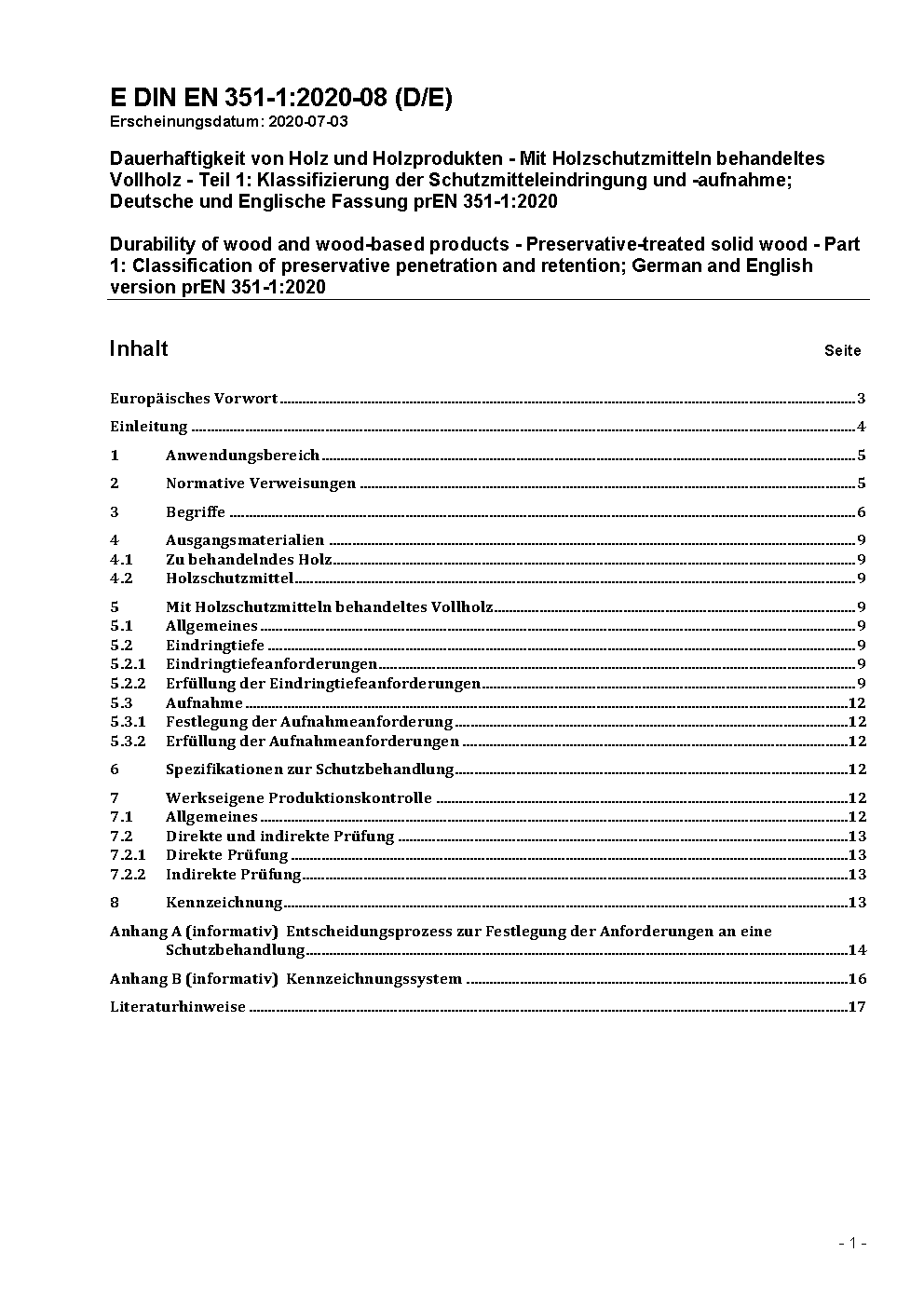 Durability of wood and wood-based products - Preservative-treated solid wood - Part 1: Classification of preservative penetration and retention; German version EN 351-1:2007