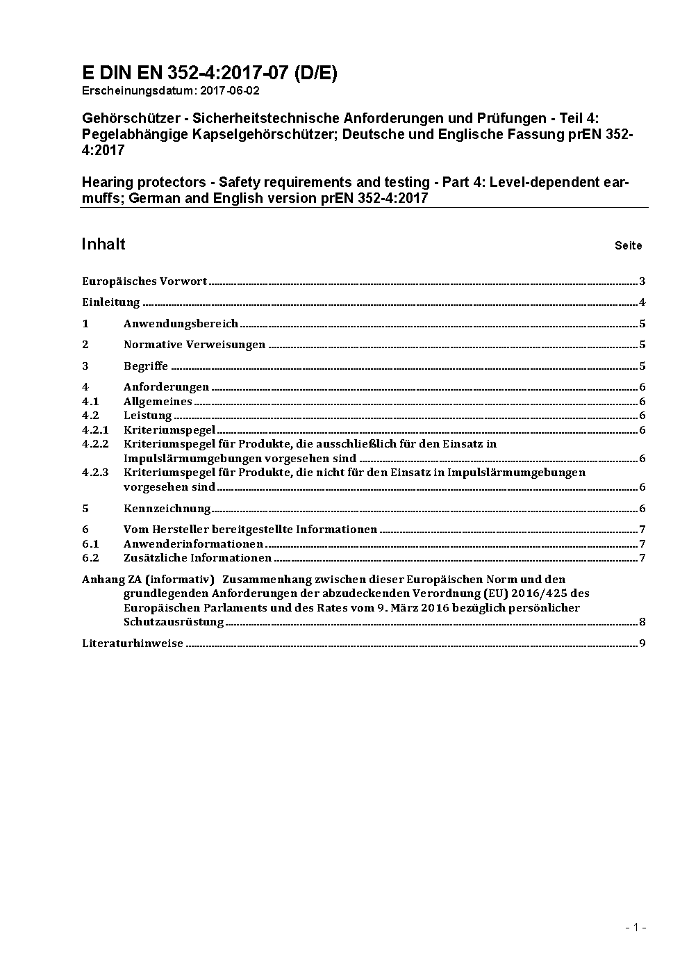 Gehörschützer - Sicherheitstechnische Anforderungen und Prüfungen - Teil 4: Pegelabhängige Kapselgehörschützer; Deutsche und Englische Fassung prEN 352-4:2017