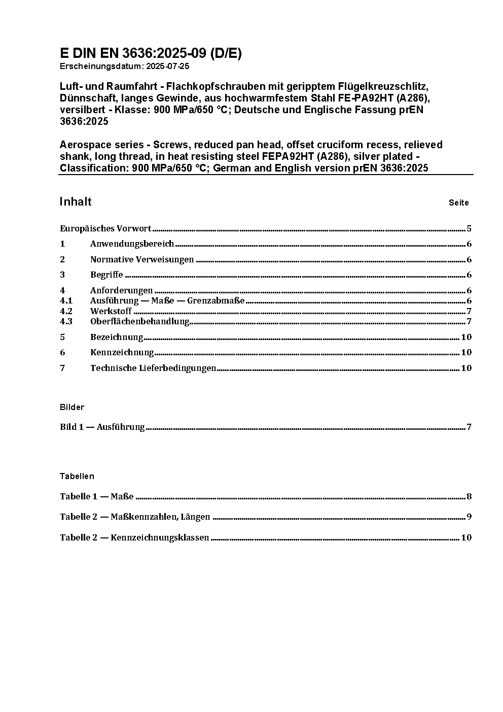 Luft- und Raumfahrt - Flachkopfschrauben mit geripptem Flügelkreuzschlitz, Dünnschaft, langes Gewinde, aus hochwarmfestem Stahl FE-PA92HT (A286), versilbert - Klasse: 900 MPa/650 °C; Deutsche und Englische Fassung prEN 3636:2025
