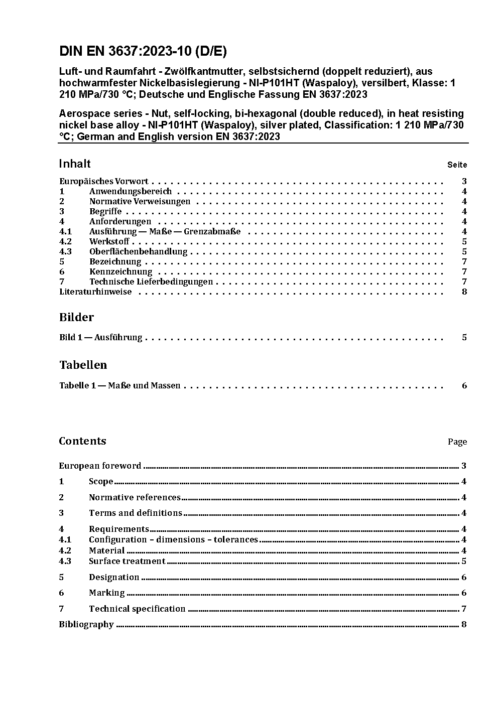 Aerospace series - Nuts, self-locking, bi-hexagonal (double reduced), in heat resisting nickel base alloy - NI-P101HT (Waspaloy), silver plated, Classification: 1 210 MPa/730 °C; German and English version EN 3637:2008