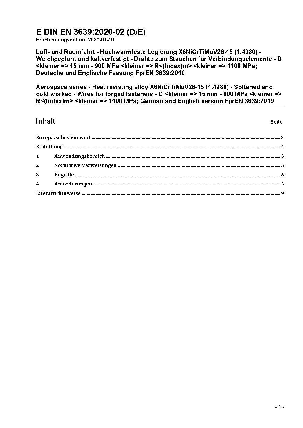 Luft- und Raumfahrt - Hochwarmfeste Legierung FE-PA2601, weichgeglüht und kaltverfestigt; Draht zum Stauchen für Verbindungselemente D 15 mm, 900 MPa R<(Index)m> 1100 MPa