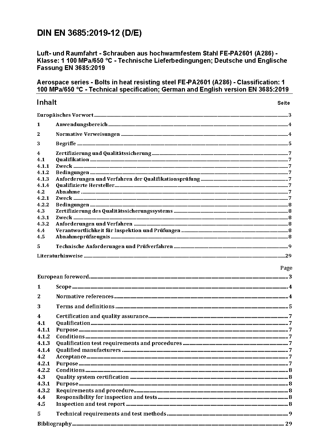 Luft- und Raumfahrt - Schrauben aus hochwarmfestem Stahl FE-PA2601 (A286) - Klasse: 1100 MPa/650 °C - Technische Lieferbedingungen; Deutsche und Englische Fassung FprEN 3685:2018