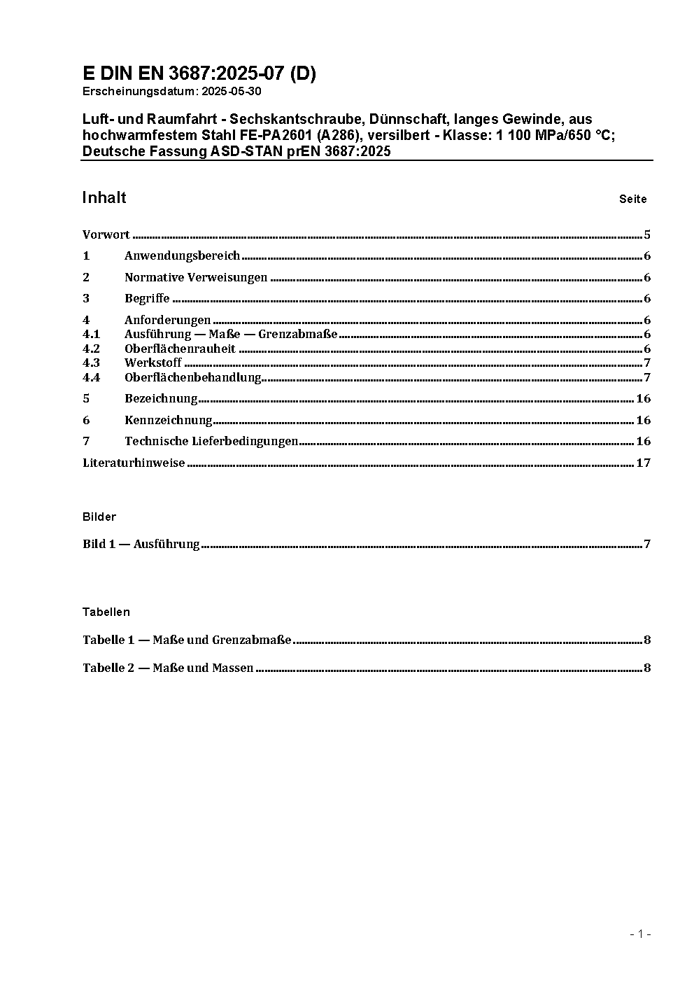 Luft- und Raumfahrt - Sechskantschrauben, Dünnschaft, langes Gewinde, aus hochwarmfestem Stahl FE-PA92HT (A286), versilbert - Klasse: 1100 MPa/650 °C; Deutsche und Englische Fassung EN 3687:2010