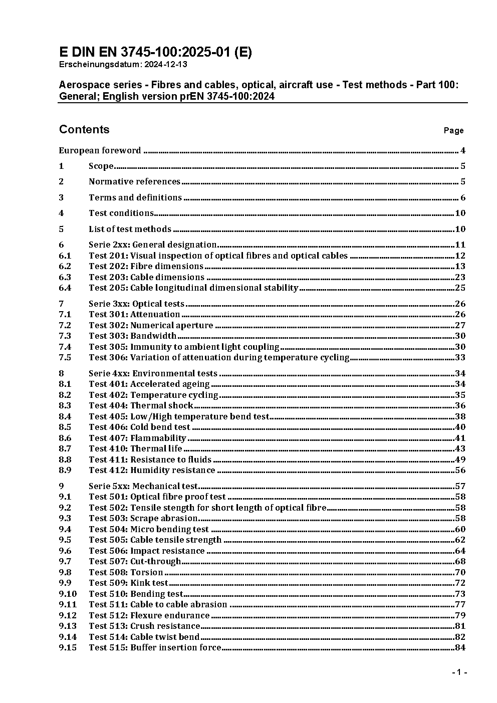Luft- und Raumfahrt - Faseroptische Leitungen für Luftfahrzeuge - Prüfverfahren - Teil 100: Allgemeines; Deutsche und Englische Fassung EN 3745-100:2008