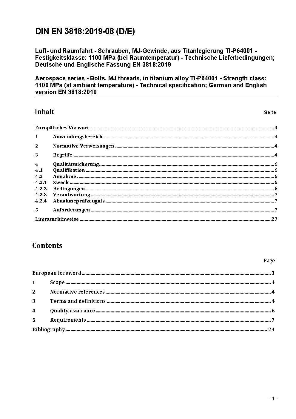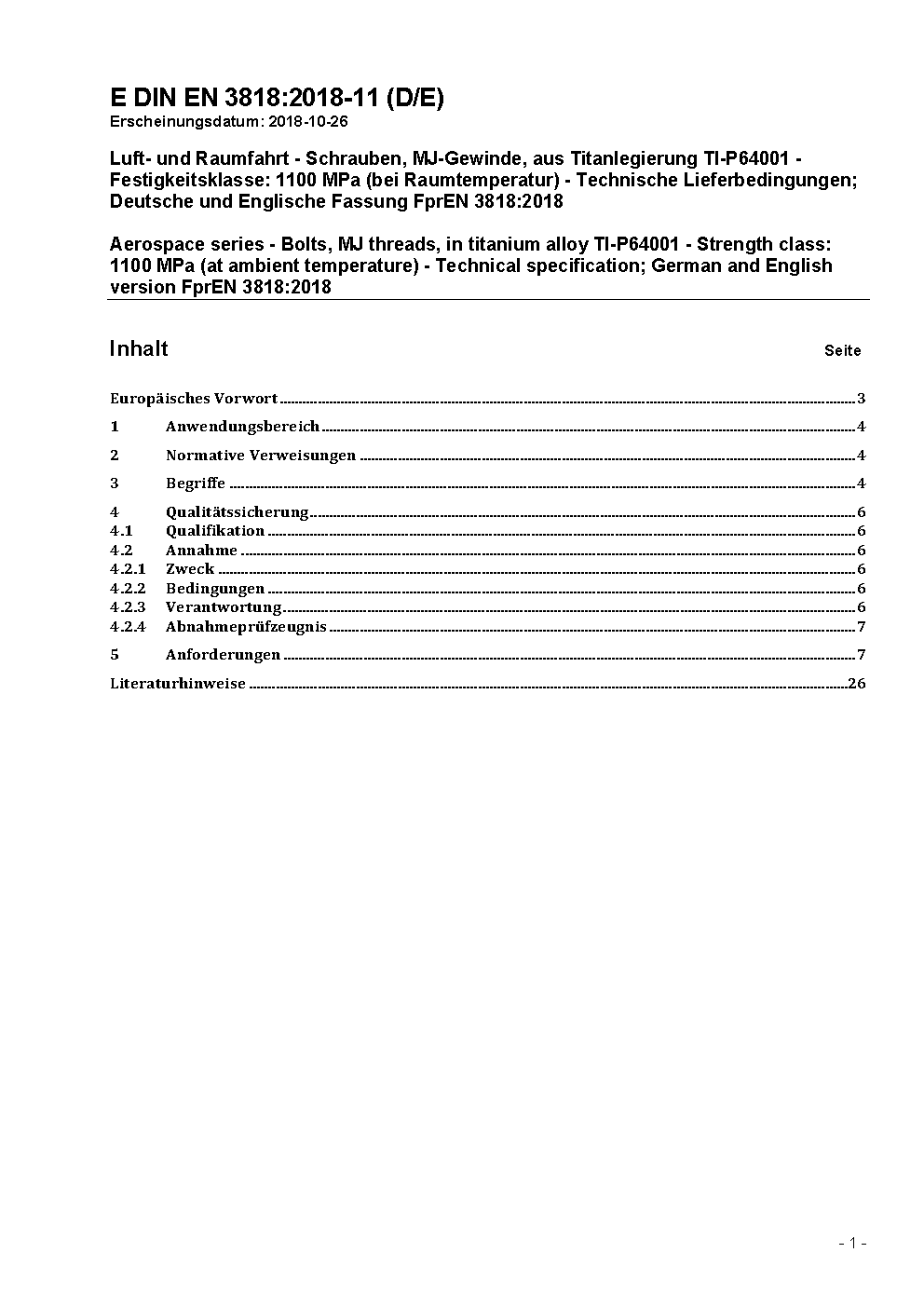 Luft- und Raumfahrt - Schrauben, MJ-Gewinde, aus Titanlegierung TI-P64001 - Festigkeitsklasse: 1100 MPa (bei Raumtemperatur) - Technische Lieferbedingungen; Deutsche und Englische Fassung EN 3818:2019