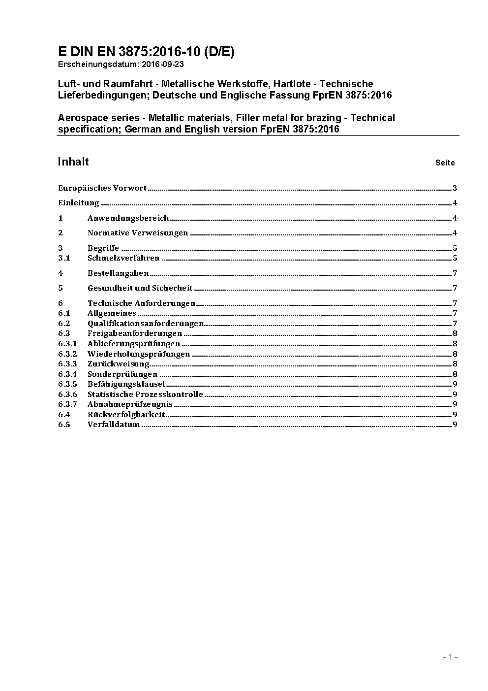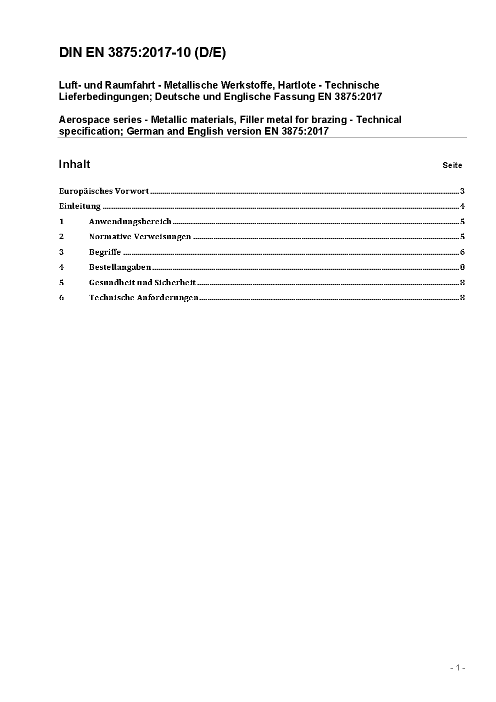 Aerospace series - Metallic materials, Filler metal for brazing - Technical specification; German and English version EN 3875:2017