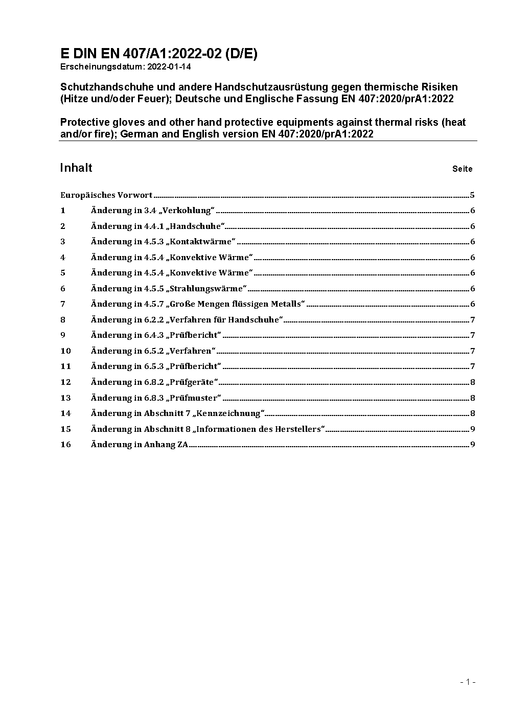 Schutzhandschuhe gegen thermische Risiken (Hitze und/oder Feuer); Deutsche und Englische Fassung prEN 407:2017