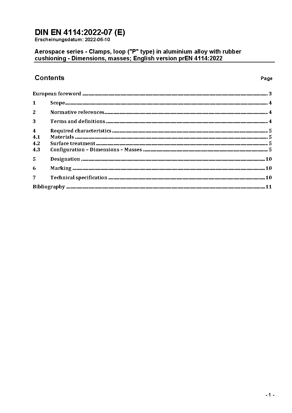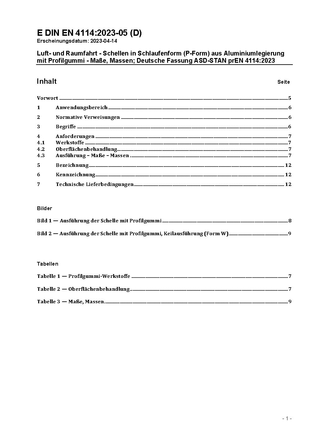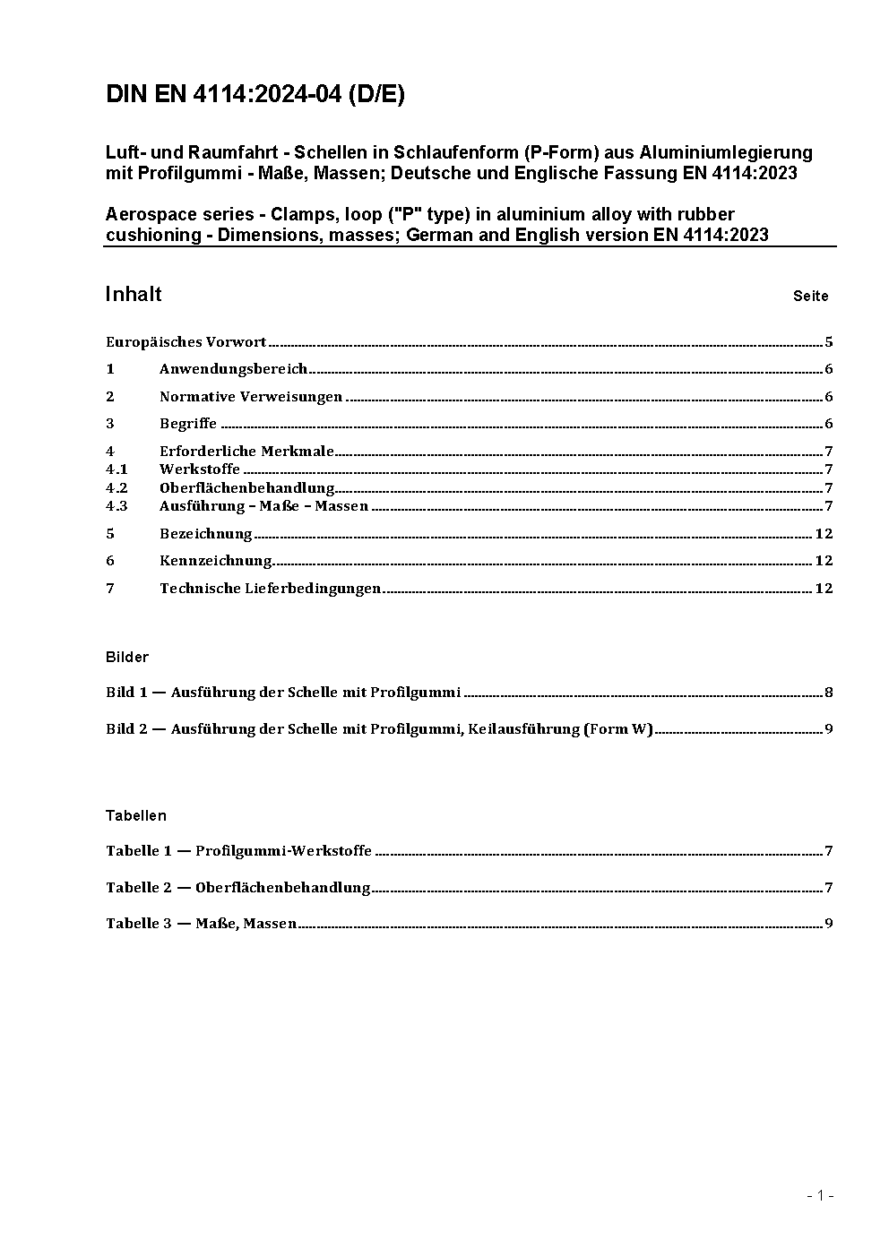 Luft- und Raumfahrt - Schellen in Schlaufenform (P-Form) aus Aluminiumlegierung mit Profilgummi - Maße, Massen; Deutsche und Englische Fassung EN 4114:2009