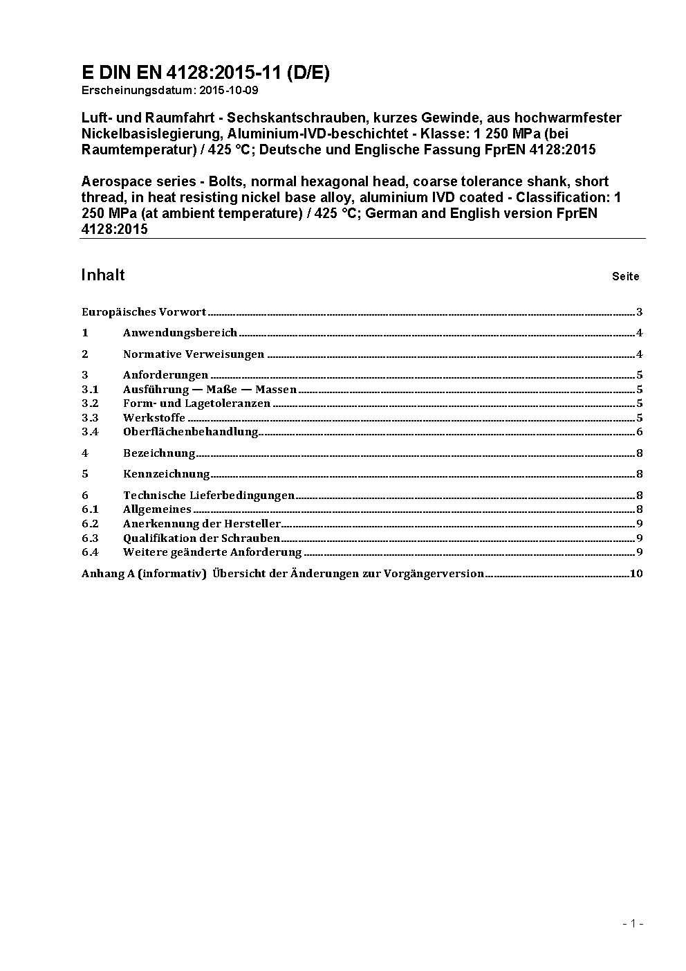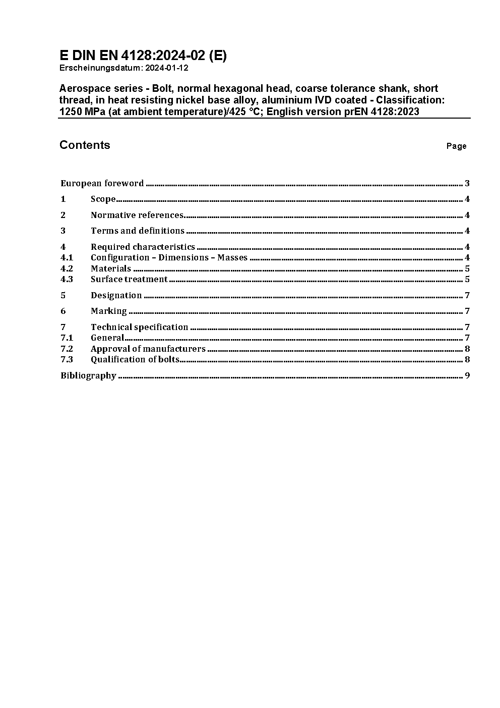 Aerospace series - Bolt, normal hexagonal head, coarse tolerance shank, short thread, in heat resisting nickel base alloy, aluminium IVD coated - Classification: 1 250 MPa (at ambient temperature)/425 °C; German and English version EN 4128:2026