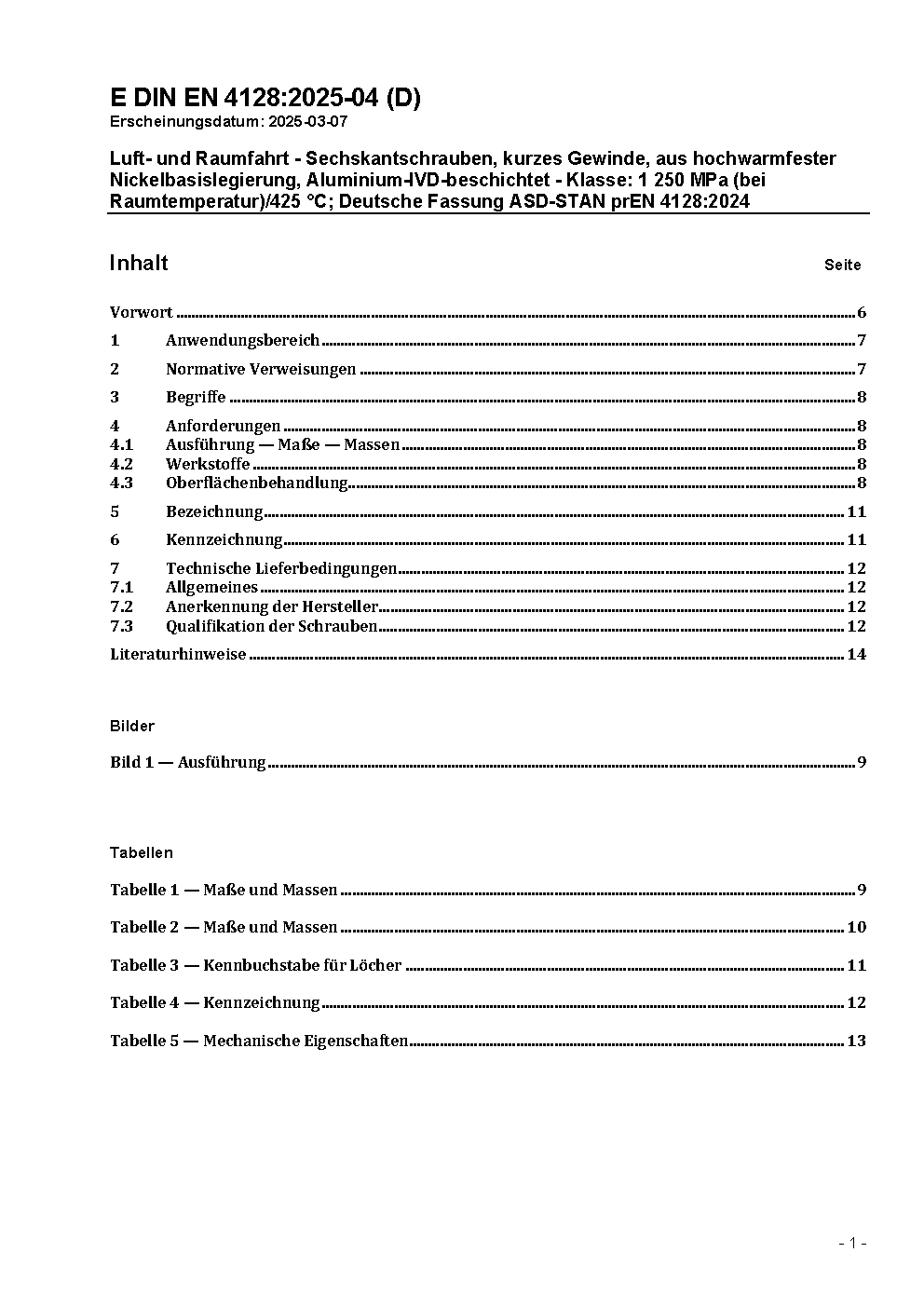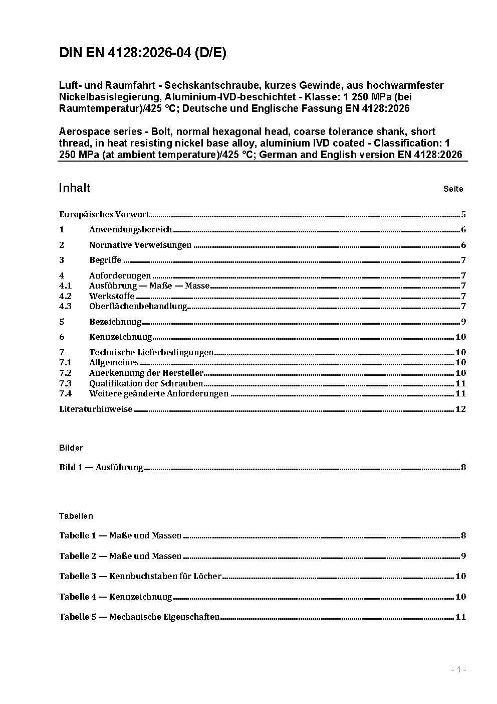 Luft- und Raumfahrt - Sechskantschraube, kurzes Gewinde, aus hochwarmfester Nickelbasislegierung, Aluminium-IVD-beschichtet - Klasse: 1 250 MPa (bei Raumtemperatur)/425 °C; Deutsche und Englische Fassung EN 4128:2026