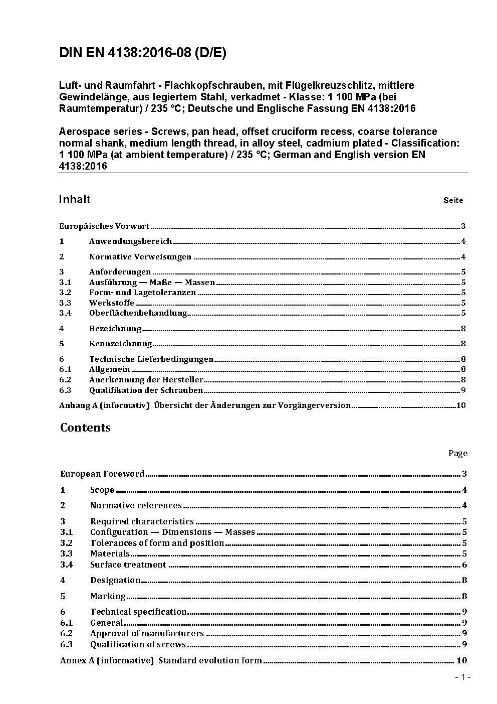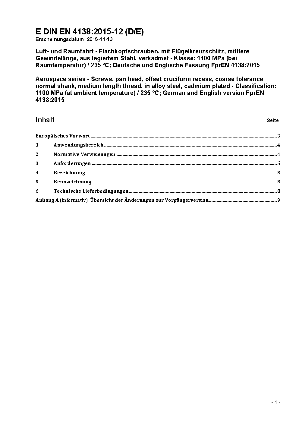 Luft- und Raumfahrt; Flachkopfschrauben mit Flügelkreuzschlitz, mittlere Gewindelänge, aus legiertem Stahl, verkadmet; Klasse: 1100 MPa (bei Raumtemperatur)/235 °C