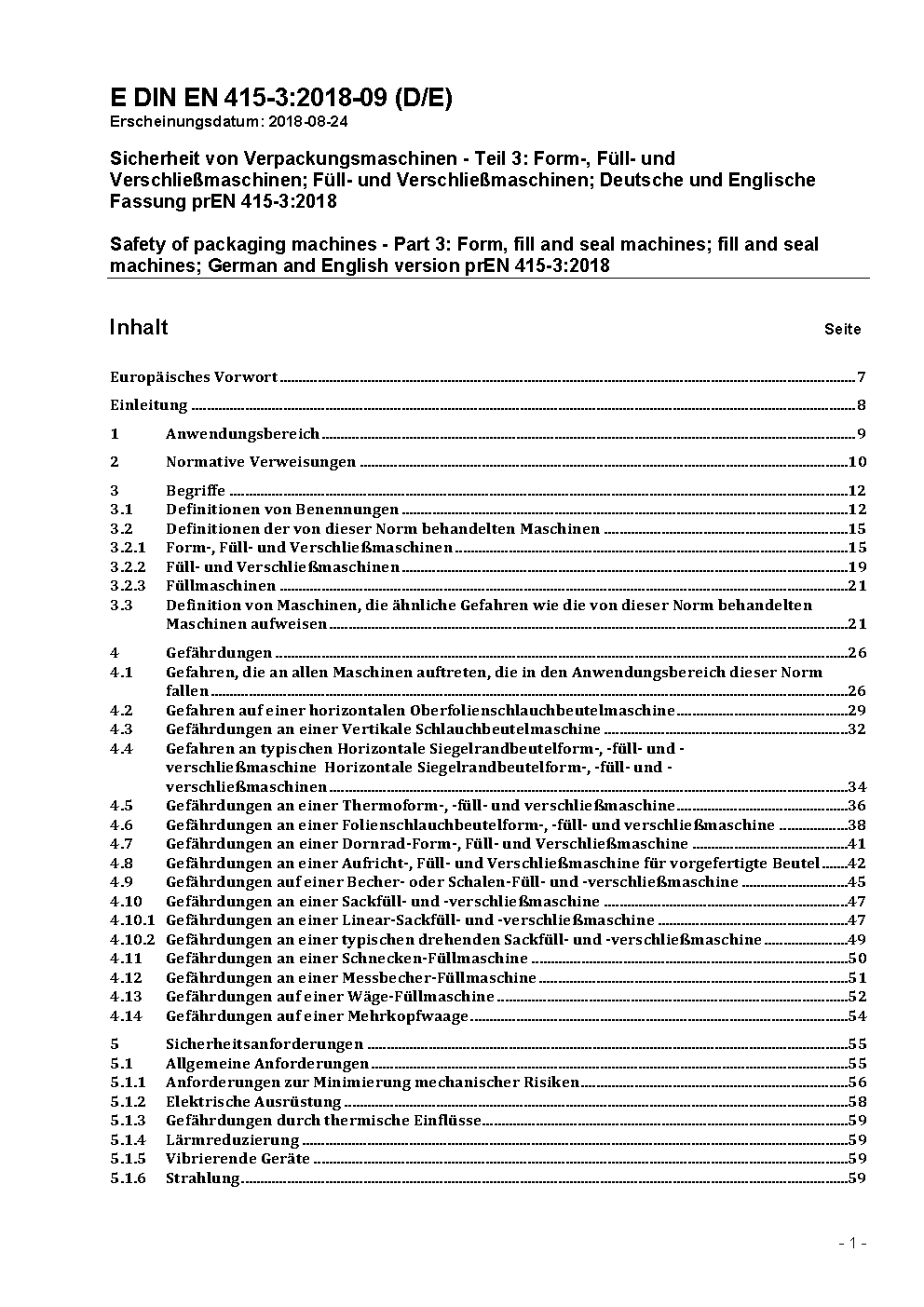 Sicherheit von Verpackungsmaschinen - Teil 3: Form-, Füll- und Verschließmaschinen; Englische Fassung EN 415-3:1999/FprA1:2009