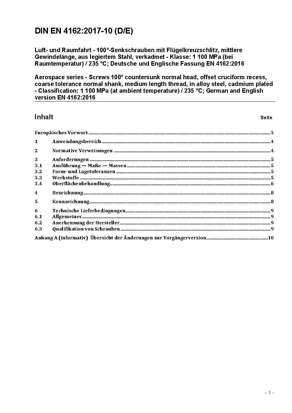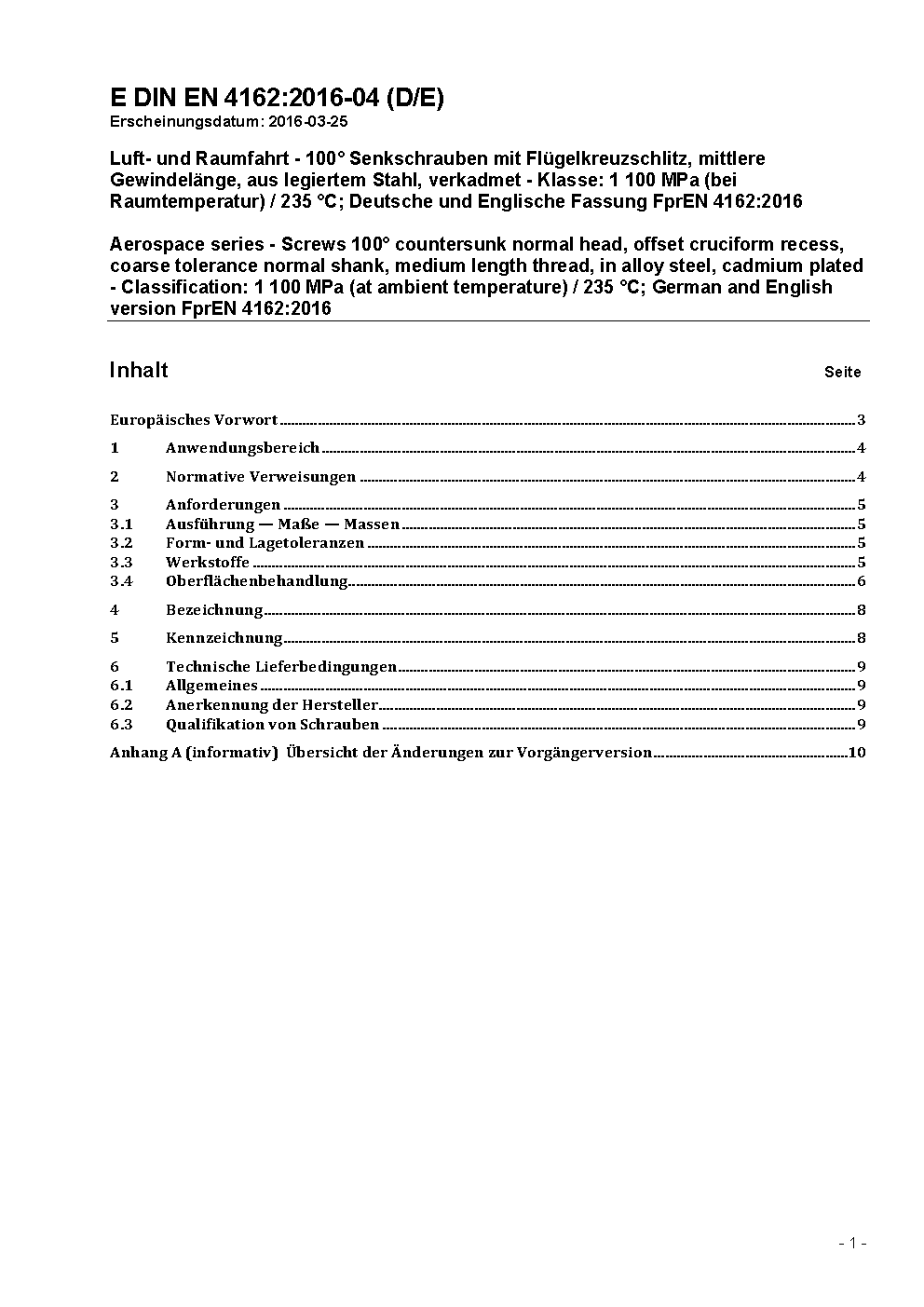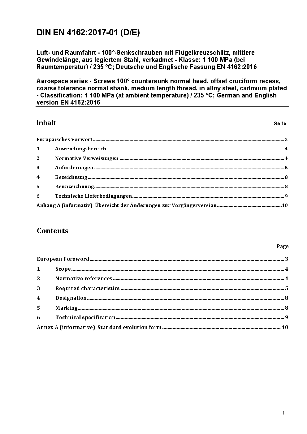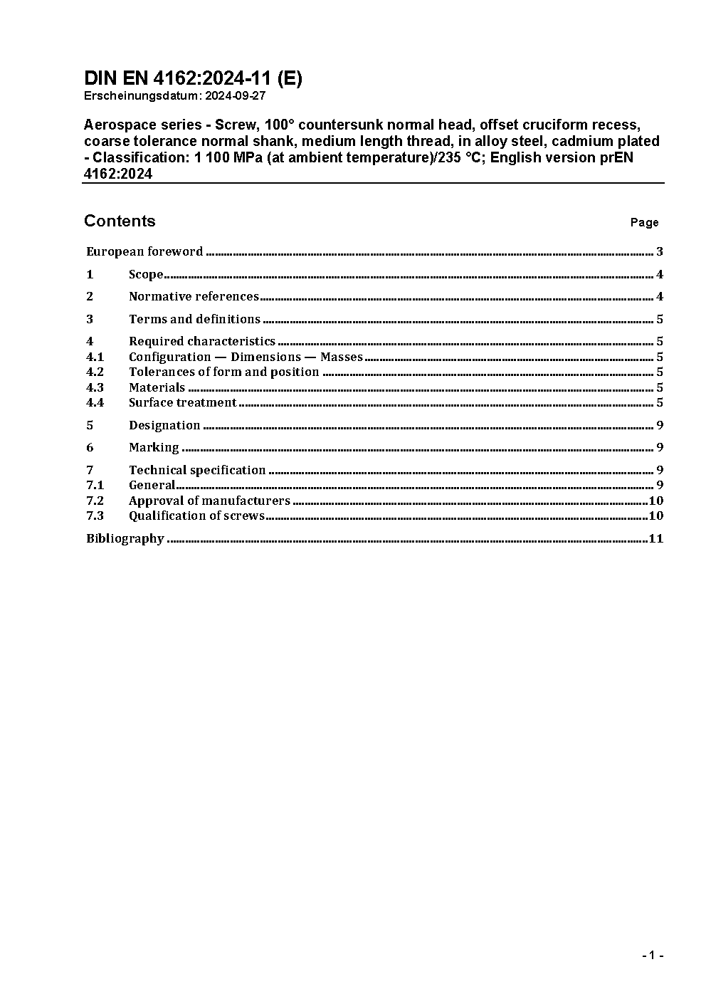 Aerospace series - Screw, 100° countersunk normal head, offset cruciform recess, coarse tolerance normal shank, medium length thread, in alloy steel, cadmium plated - Classification: 1 100 MPa (at ambient temperature)/235 °C; English version prEN 4162:2024