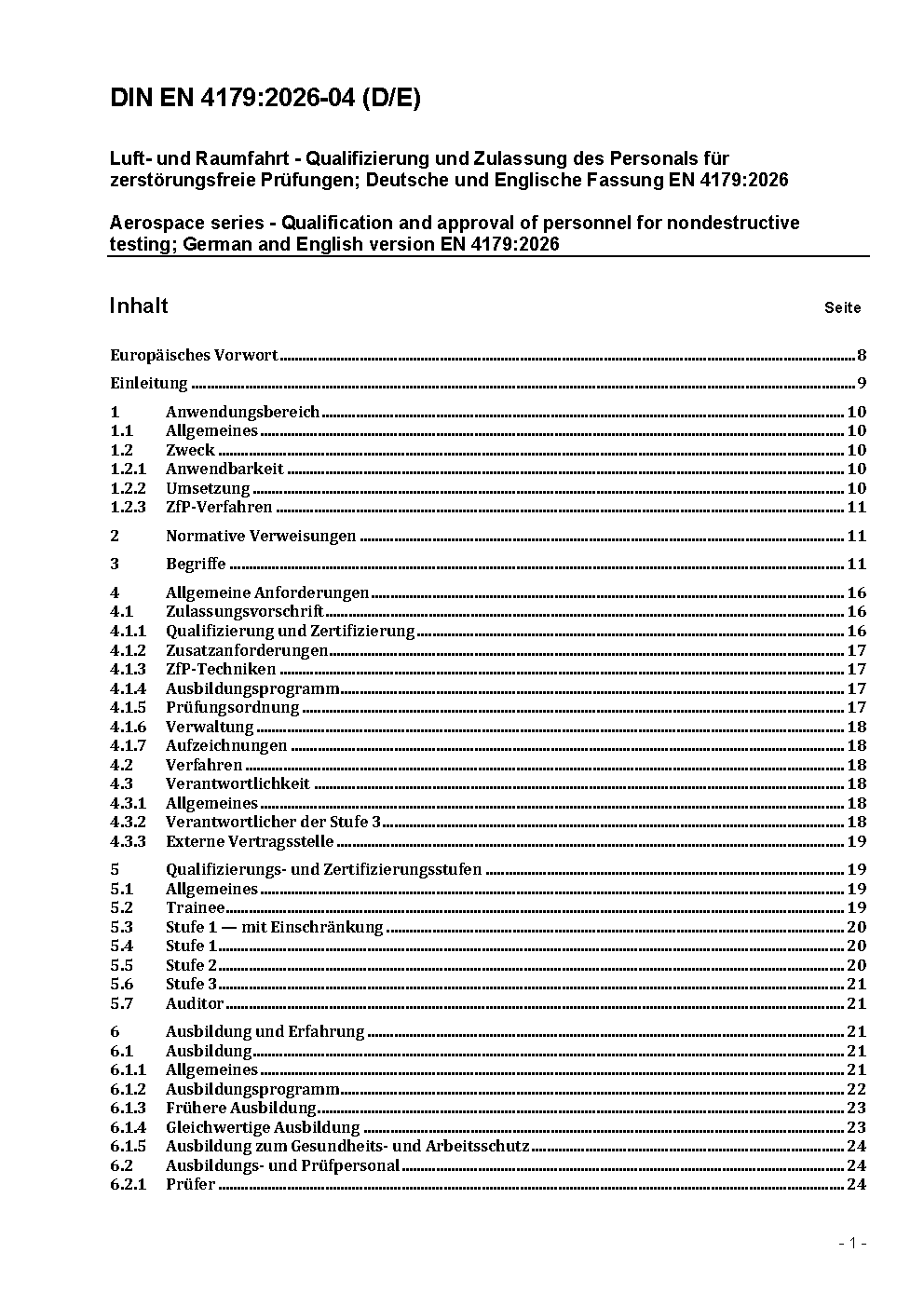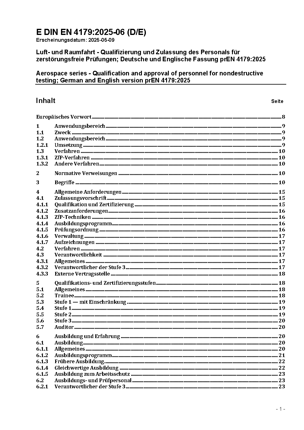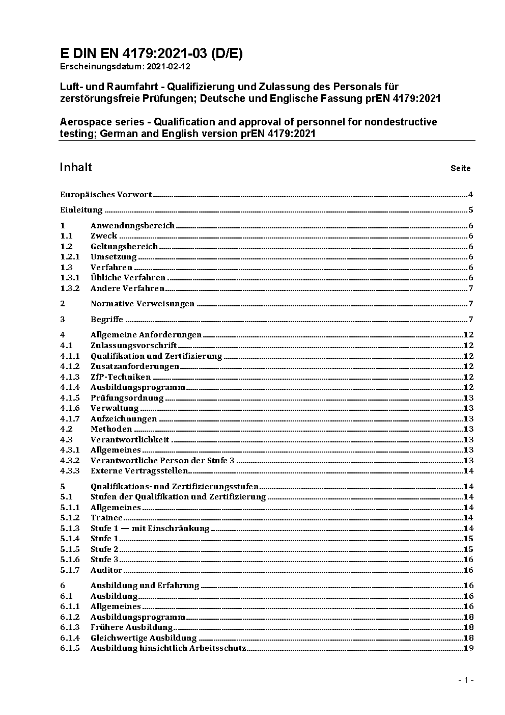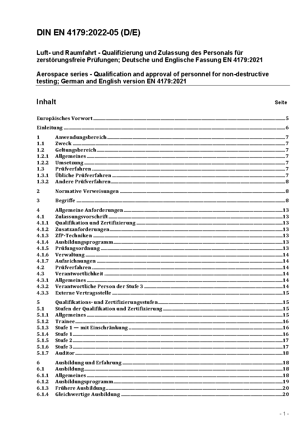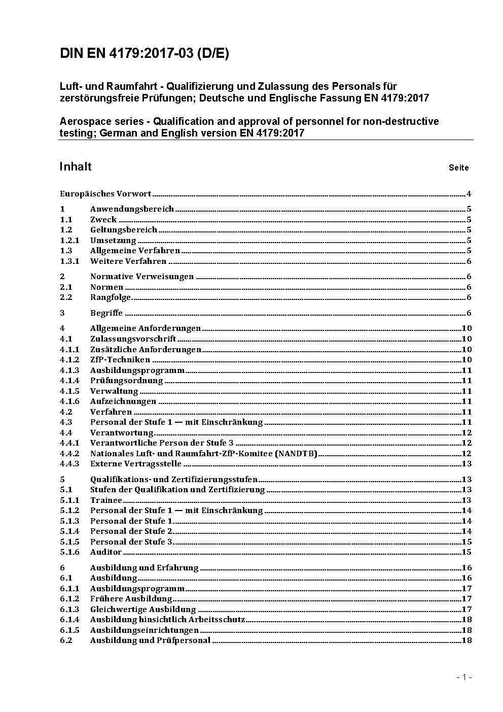 Luft- und Raumfahrt - Qualifizierung und Zulassung des Personals für zerstörungsfreie Prüfungen; Deutsche und Englische Fassung EN 4179:2017