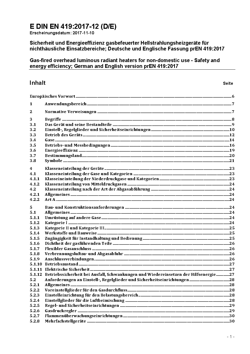 Sicherheit und Energieeffizienz gasbefeuerter Hellstrahlungsheizgeräte für nichthäusliche Einsatzbereiche; Deutsche und Englische Fassung prEN 419:2017