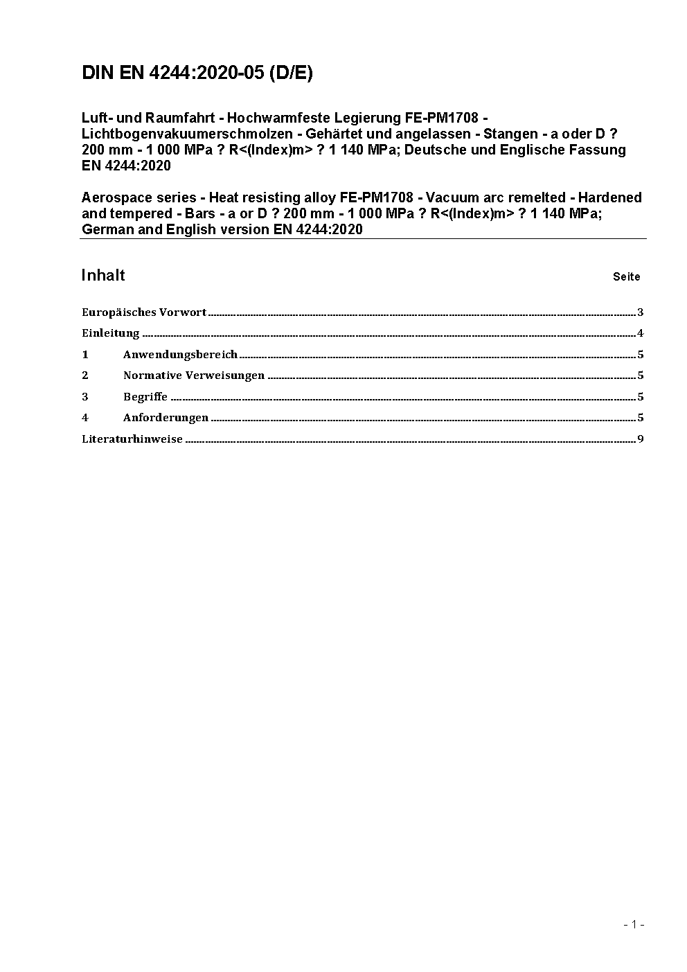 Luft- und Raumfahrt - Hochwarmfeste Legierung FE-PM1708 - Vakuumlichtbogenerschmolzen, gehärtet und angelassen, Stangen a oder D, 200 mm, 1000 MPa R<(Index)m> 1140 MPa