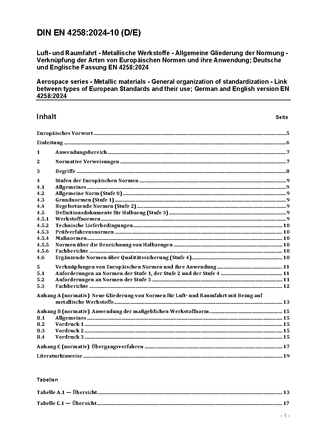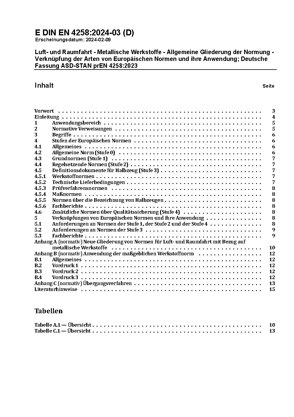 Luft- und Raumfahrt - Metallische Werkstoffe - Allgemeine Gliederung der Normung - Verknüpfung der Arten von Europäischen Normen und ihre Anwendung; Deutsche Fassung ASD-STAN prEN 4258:2023