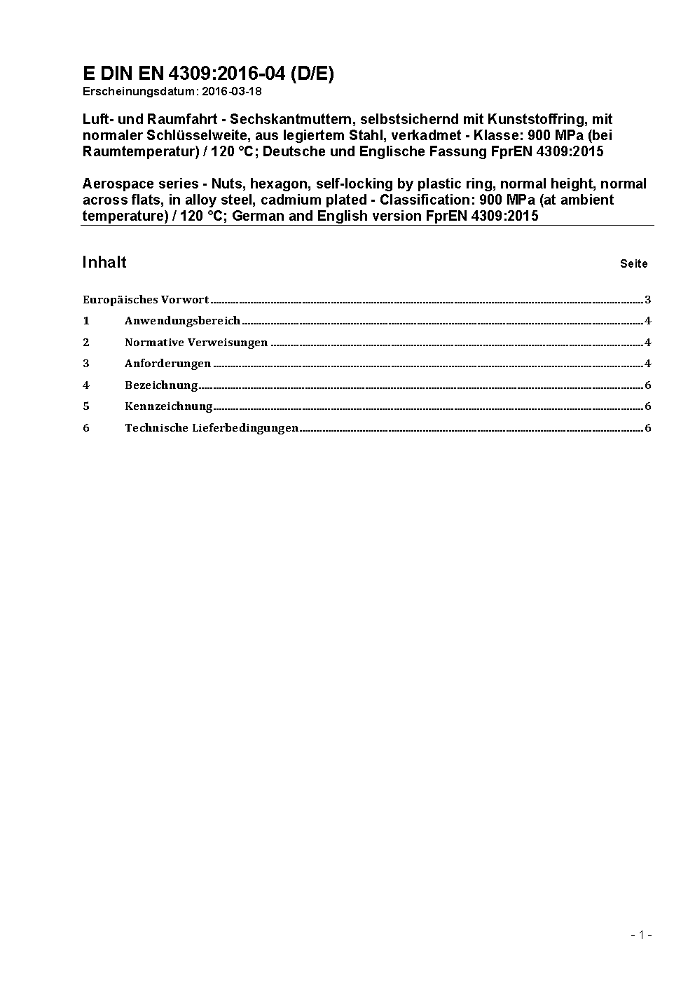 Luft- und Raumfahrt - Sechskantmuttern, selbstsichernd mit Plastikring, mit normaler Schlüsselweite, aus legiertem Stahl, verkadmet; Klasse: 900 MPa (bei Raumtemperatur)/120 °C