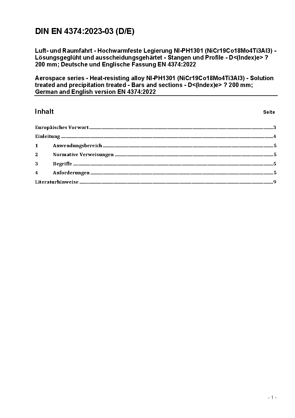 Luft- und Raumfahrt - Hochwarmfeste Legierung NI-PH1301 (NiCr19Co18Mo4Ti3Al3), lösungsgeglüht und ausgehärtet - Stangen und Profile, D<(Index)e> 200 mm