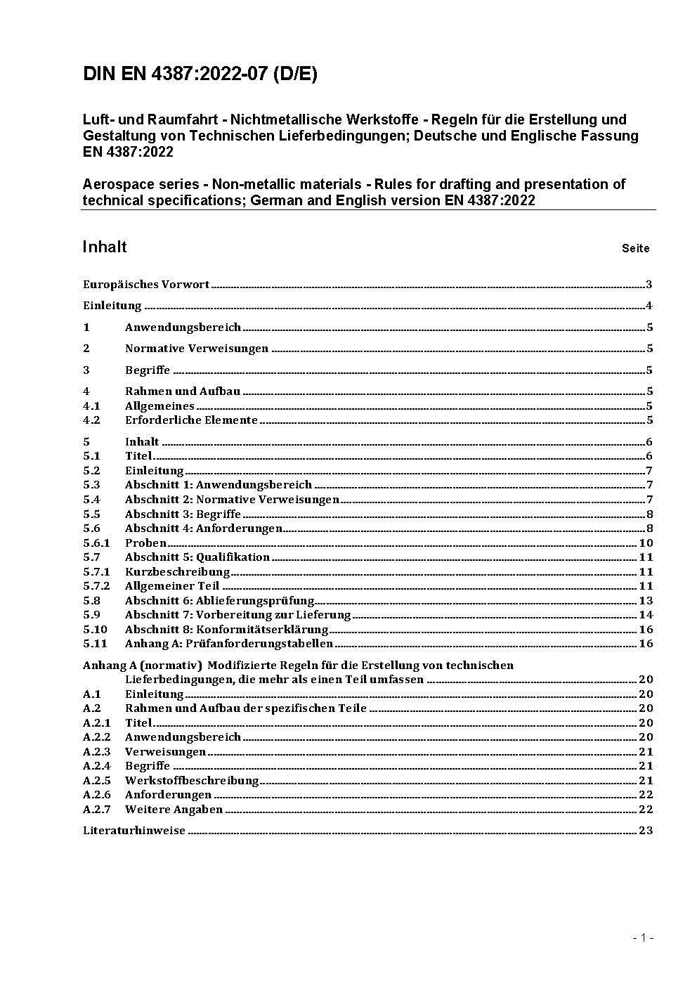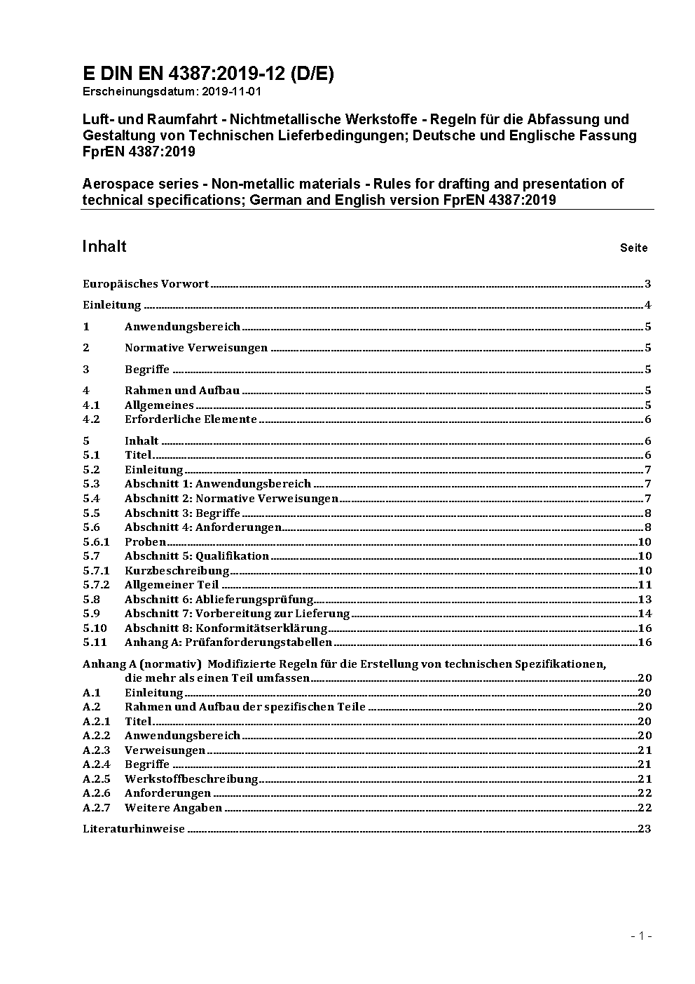 Luft- und Raumfahrt - Nichtmetallische Werkstoffe - Regeln für die Abfassung und Gestaltung von Technischen Lieferbedingungen; Deutsche und Englische Fassung FprEN 4387:2019