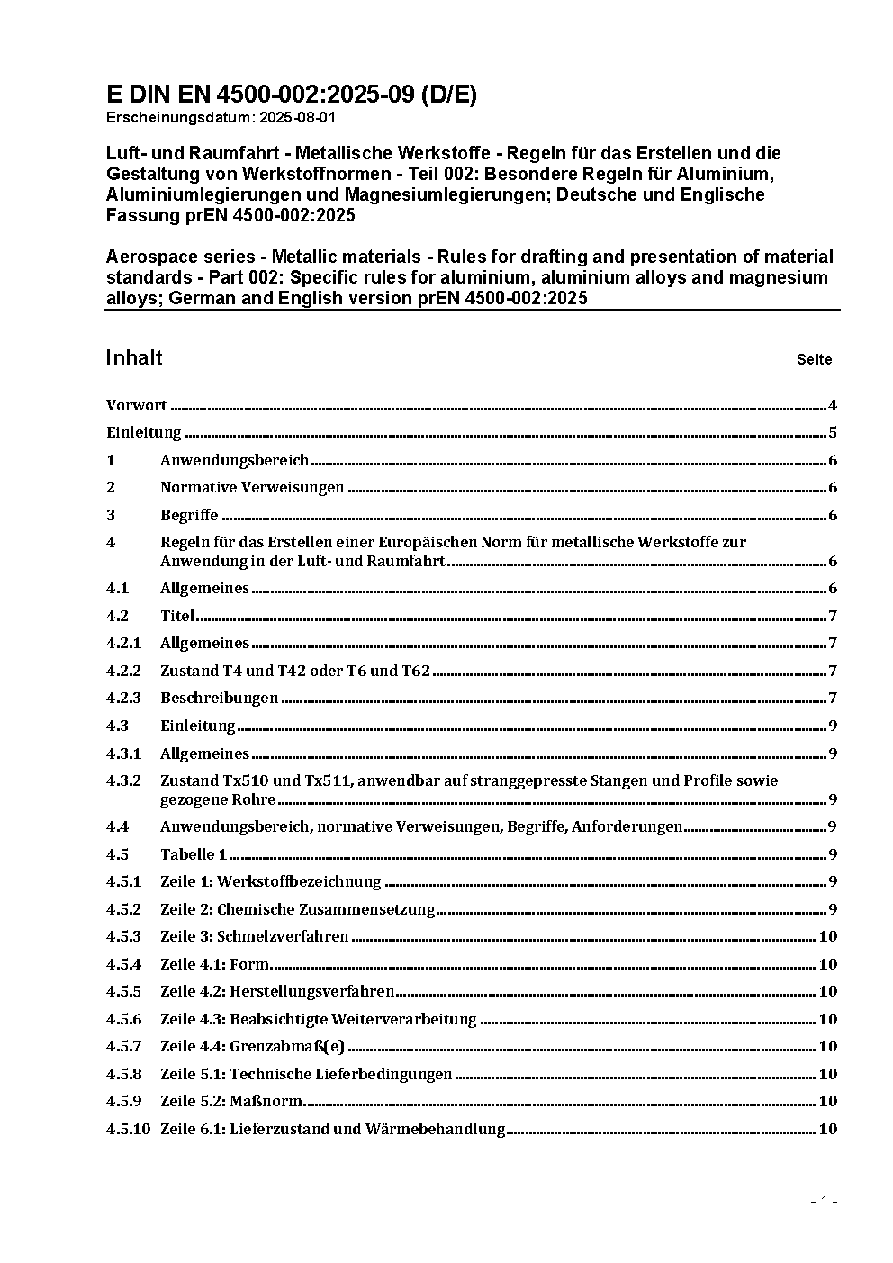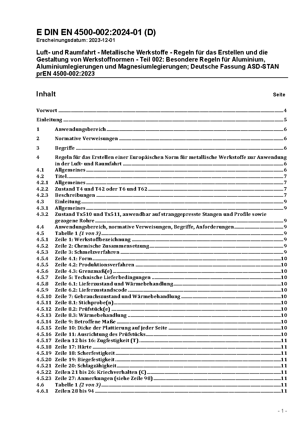 Luft- und Raumfahrt - Metallische Werkstoffe - Regeln für das Erstellen und die Gestaltung von Werkstoffnormen - Teil 002: Besondere Regeln für Aluminium, Aluminiumlegierungen und Magnesiumlegierungen; Deutsche Fassung ASD-STAN prEN 4500-002:2023
