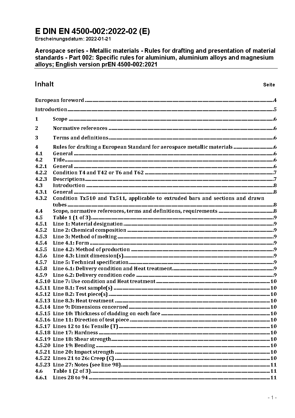 Aerospace series - Metallic materials - Rules for drafting and presentation of material standards - Part 002: Specific rules for aluminium, aluminium alloys and magnesium alloys; German version ASD-STAN prEN 4500-002:2023