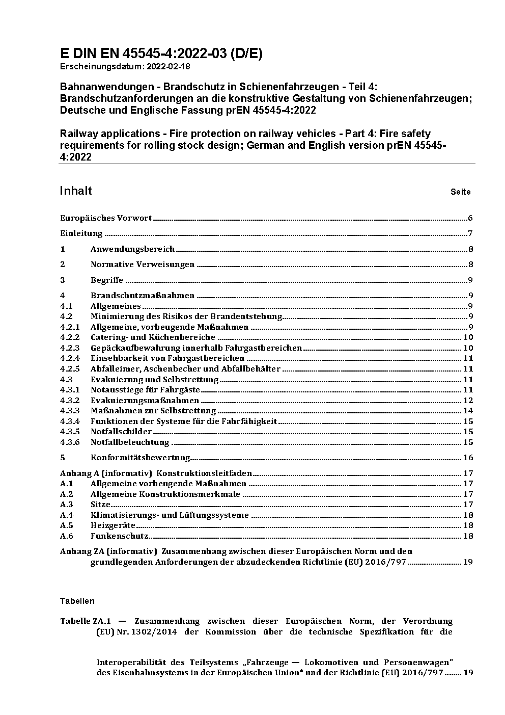 Railway applications - Fire protection of railway vehicles - Part 4: Fire safety requirements for railway rolling stock design; German version prEN 45545-4:2003