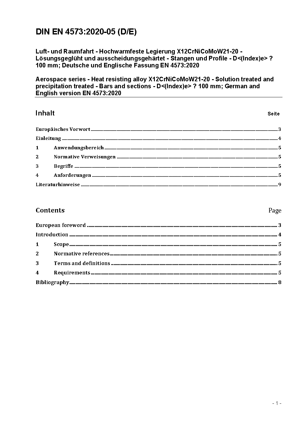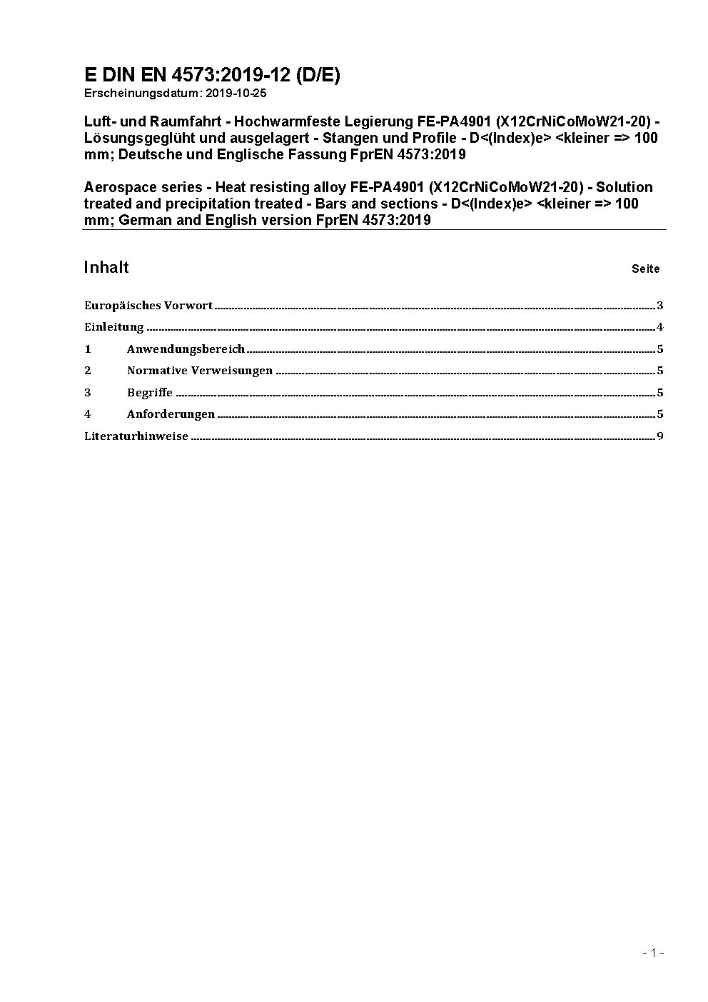 Luft- und Raumfahrt - Hochwarmfeste Legierung FE-PA4901 (X12CrNiCoMoW21-20), lösungsgeglüht und ausgelagert - Stangen und Profile D<(Index)e> 100 mm