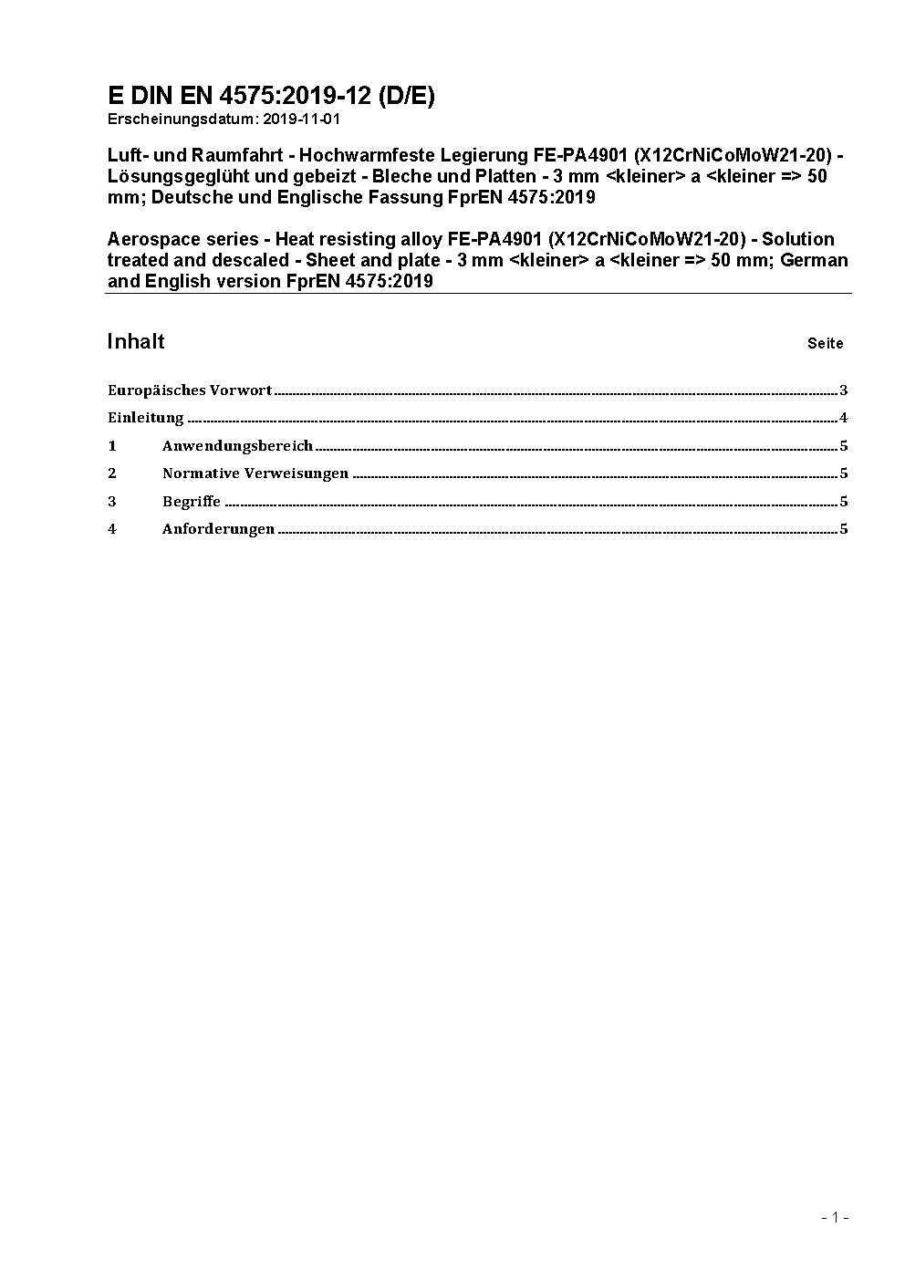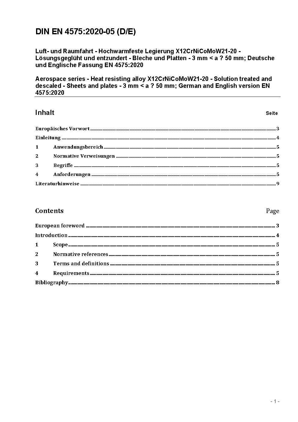 Luft- und Raumfahrt - Hochwarmfeste Legierung X12CrNiCoMoW21-20 - Lösungsgeglüht und entzundert - Bleche und Platten - 3 mm < a 50 mm; Deutsche und Englische Fassung EN 4575:2020
