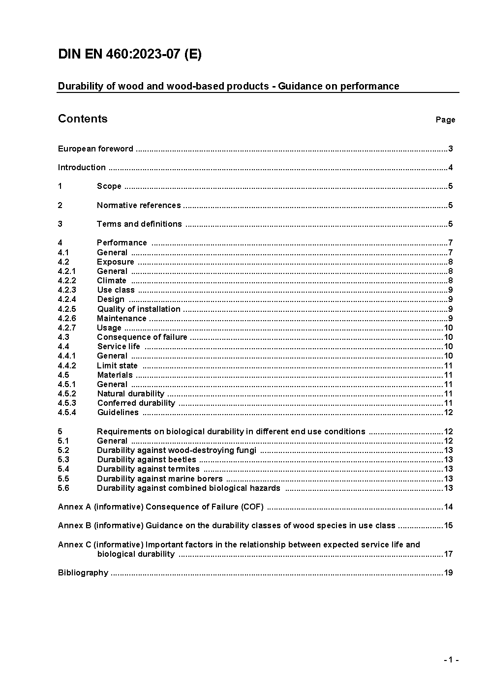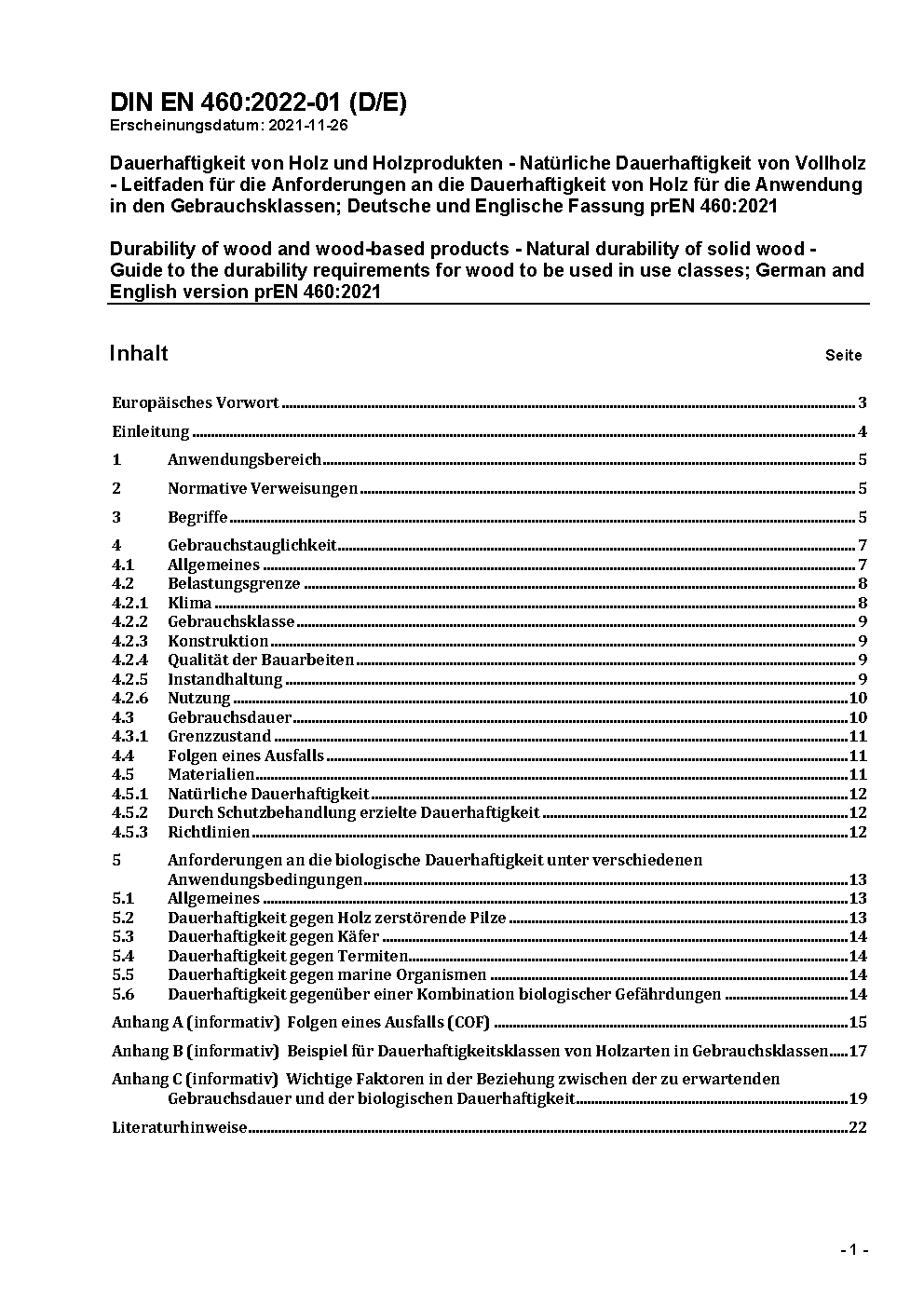 Durability of wood and wood-based products - Natural durability of solid wood - Guide to the durability requirements for wood to be used in hazard classes; German and English version prEN 460:2018