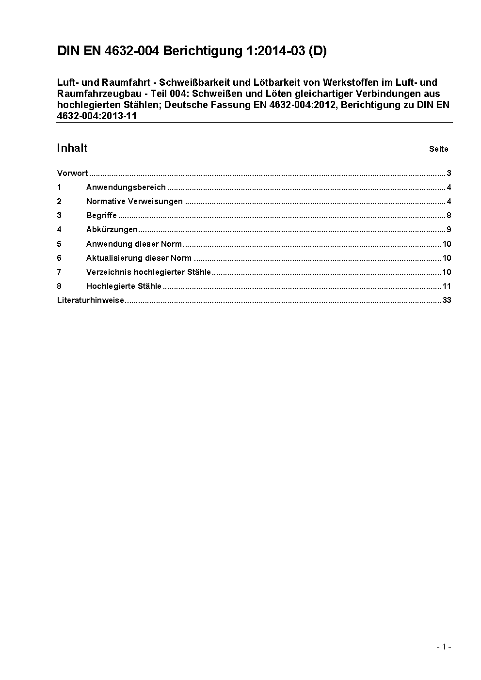 Luft- und Raumfahrt - Schweißeignung und Löteignung von Werkstoffen im Luft- und Raumfahrzeugbau - Teil 004: Schweißen und Löten gleichartiger Verbindungen aus hochlegierten Stählen; Deutsche Fassung EN 4632-004:2012