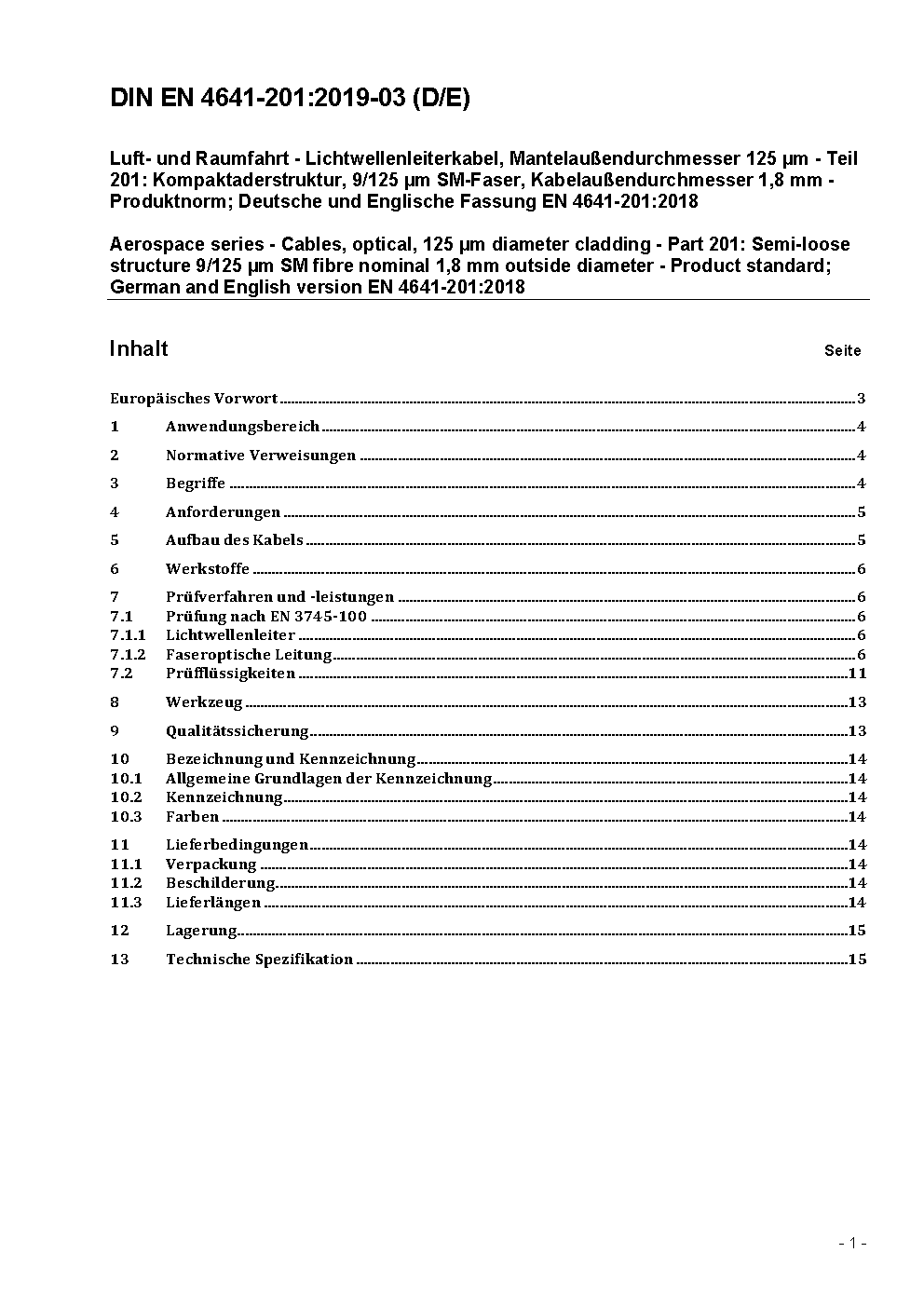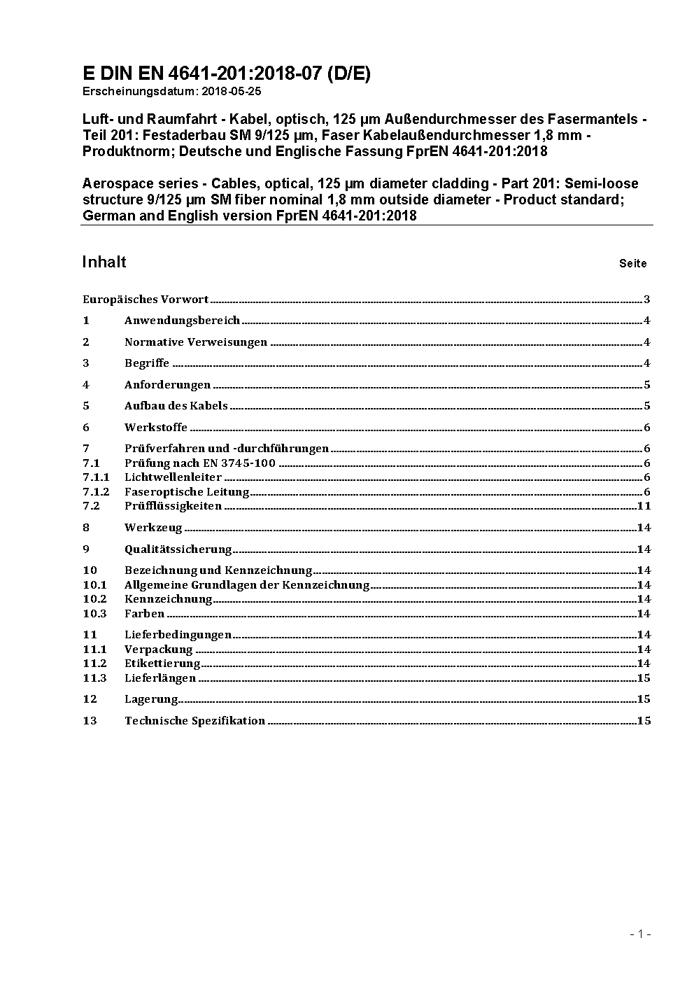 Luft- und Raumfahrt - Kabel, optisch, 125 µm Außendurchmesser des Fasermantels - Teil 201: Festaderbau SM 9/125 µm, Faser Kabelaußendurchmesser 1,8 mm - Produktnorm; Deutsche und Englische Fassung FprEN 4641-201:2018