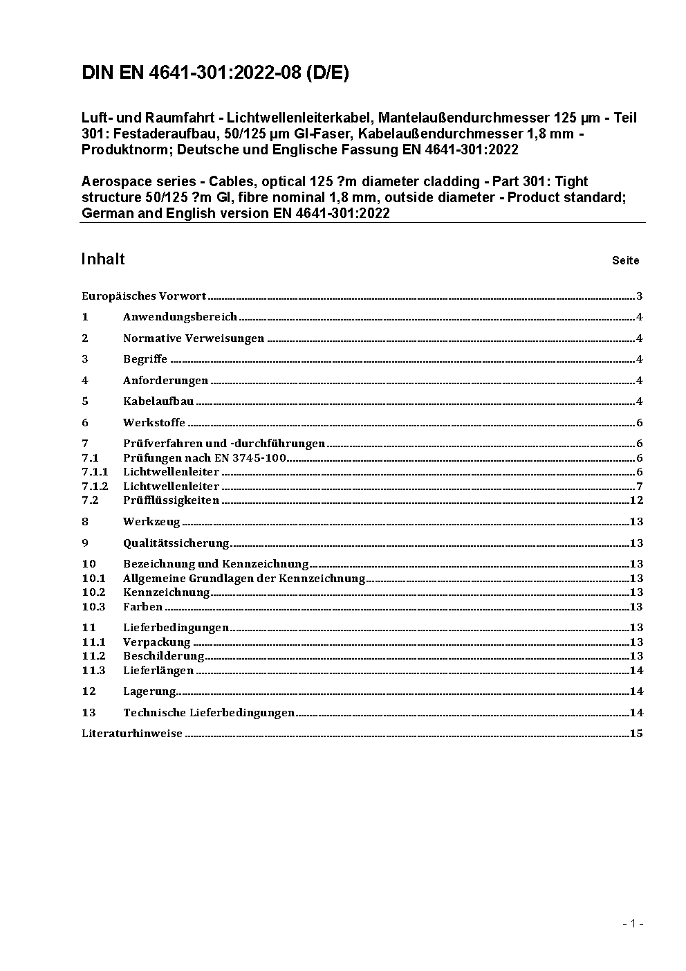 Luft- und Raumfahrt - Lichtwellenleiterkabel, Claddingdurchmesser 125 µm - Teil 301: Festaderaufbau GI 50/125 µm, Faser Kabelaußendurchmesser 1,8 mm - Produktnorm; Deutsche Fassung ASD-STAN prEN 4641-301:2023