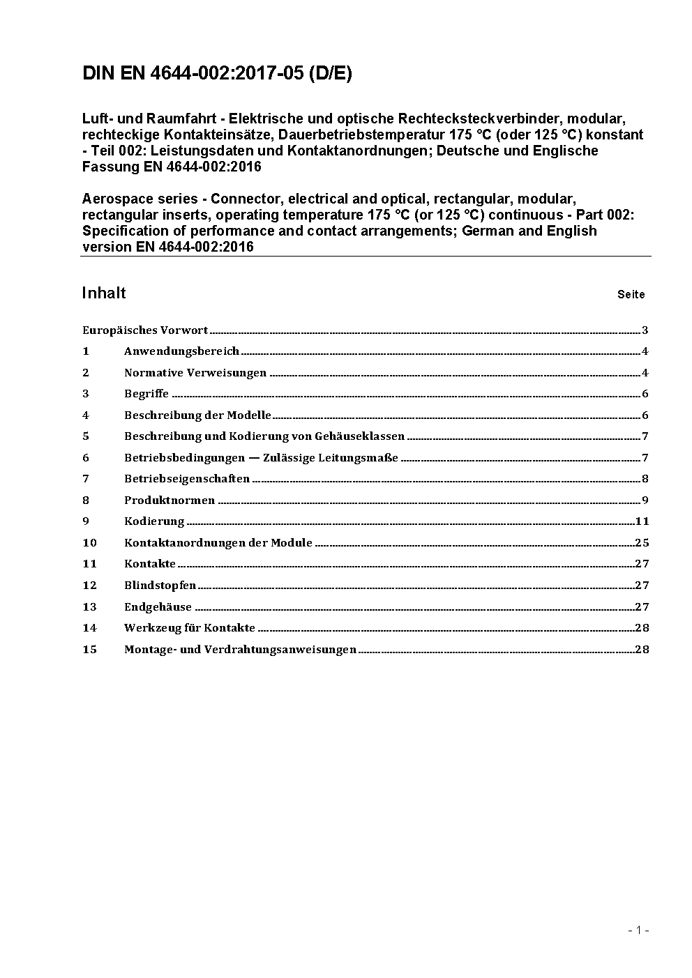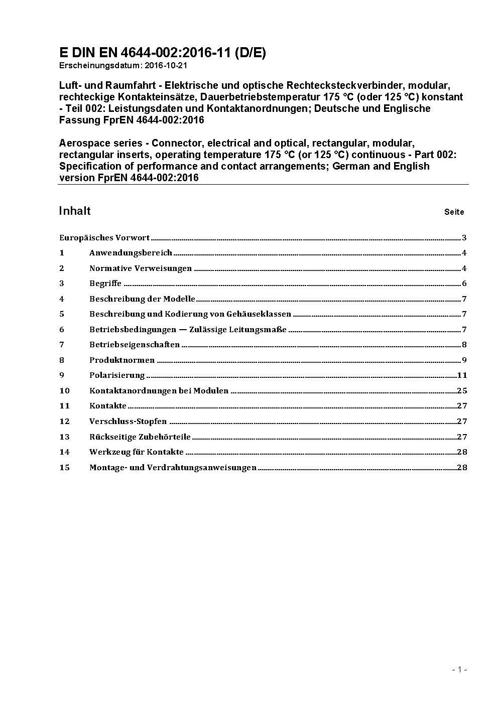 Luft- und Raumfahrt - Elektrische und optische Rechtecksteckverbinder, modular, rechteckige Kontakteinsätze, Dauerbetriebstemperatur 175 °C (oder 125 °C) konstant - Teil 002: Leistungsdaten und Kontaktanordnungen; Deutsche und Englische Fassung FprEN 4644-002:2016