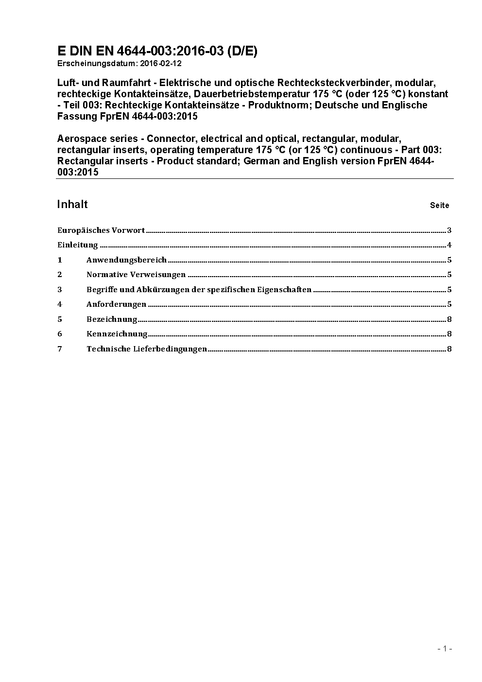Luft- und Raumfahrt - Elektrische und optische Rechtecksteckverbinder, modular, rechteckige Kontakteinsätze, Dauerbetriebstemperatur 175 °C (oder 125 °C) - Teil 003: Rechteckige Kontakteinsätze - Produktnorm; Deutsche und Englische Fassung FprEN 4644-003:2011