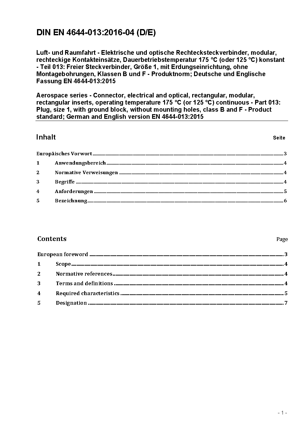 Luft- und Raumfahrt - Elektrische und optische Rechtecksteckverbinder, modular, rechteckige Kontakteinsätze, Dauerbetriebstemperatur 175 °C (oder 125 °C) konstant - Teil 013: Freier Steckverbinder, Größe 1, mit Erdungseinrichtung, Klassen B und F - Produktnorm; Deutsche und Englische Fassung FprEN 4644-013:2015