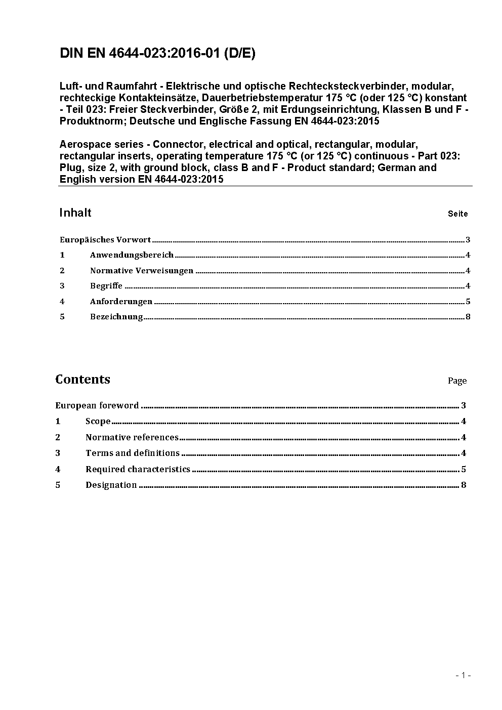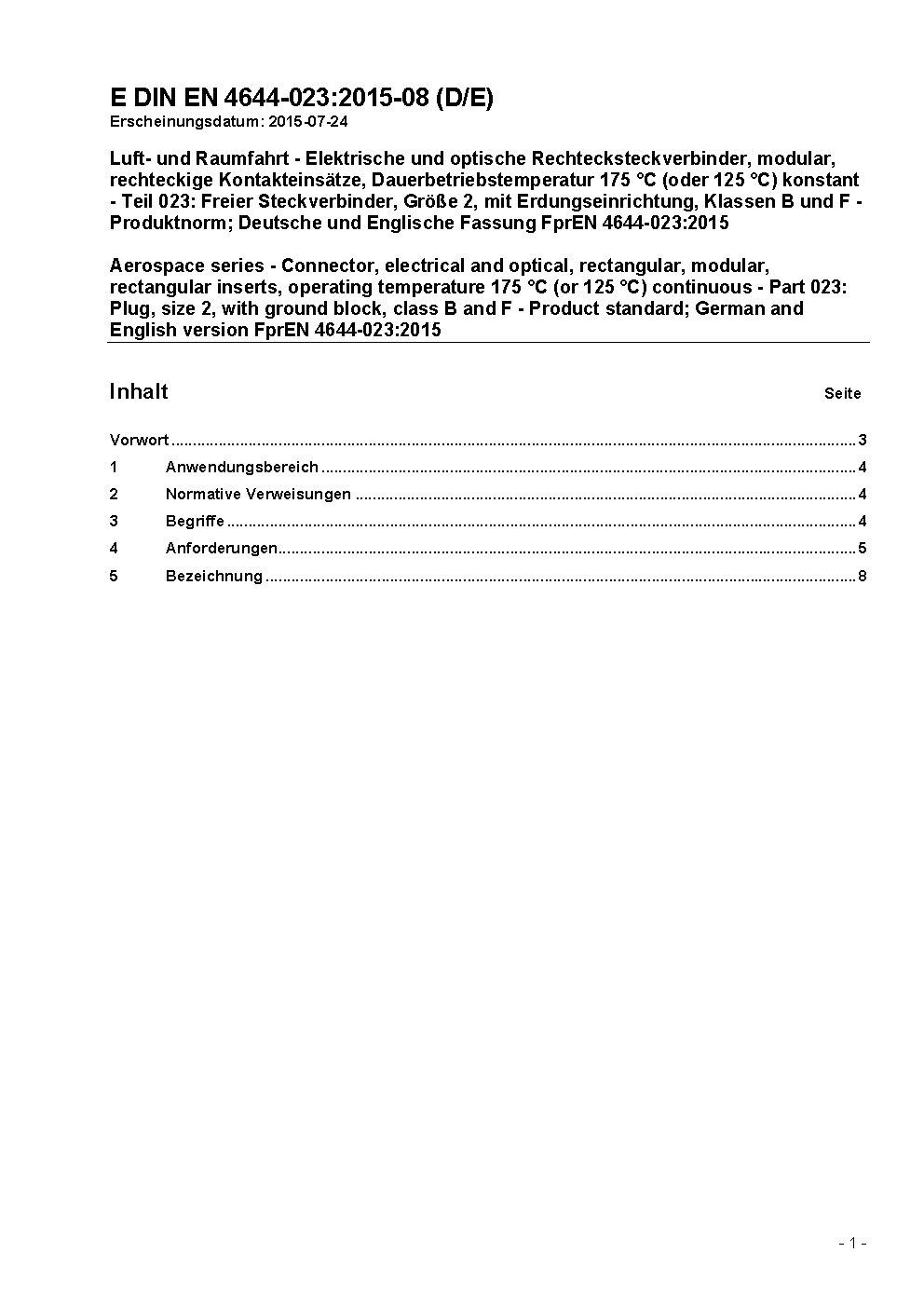 Luft- und Raumfahrt - Elektrische und optische Rechtecksteckverbinder, modular, rechteckige Kontakteinsätze, Dauerbetriebstemperatur 175 °C (oder 125 °C) konstant - Teil 023: Freier Steckverbinder, Größe 2, mit Erdungseinrichtung, Klassen B und F - Produktnorm; Deutsche und Englische Fassung EN 4644-023:2015