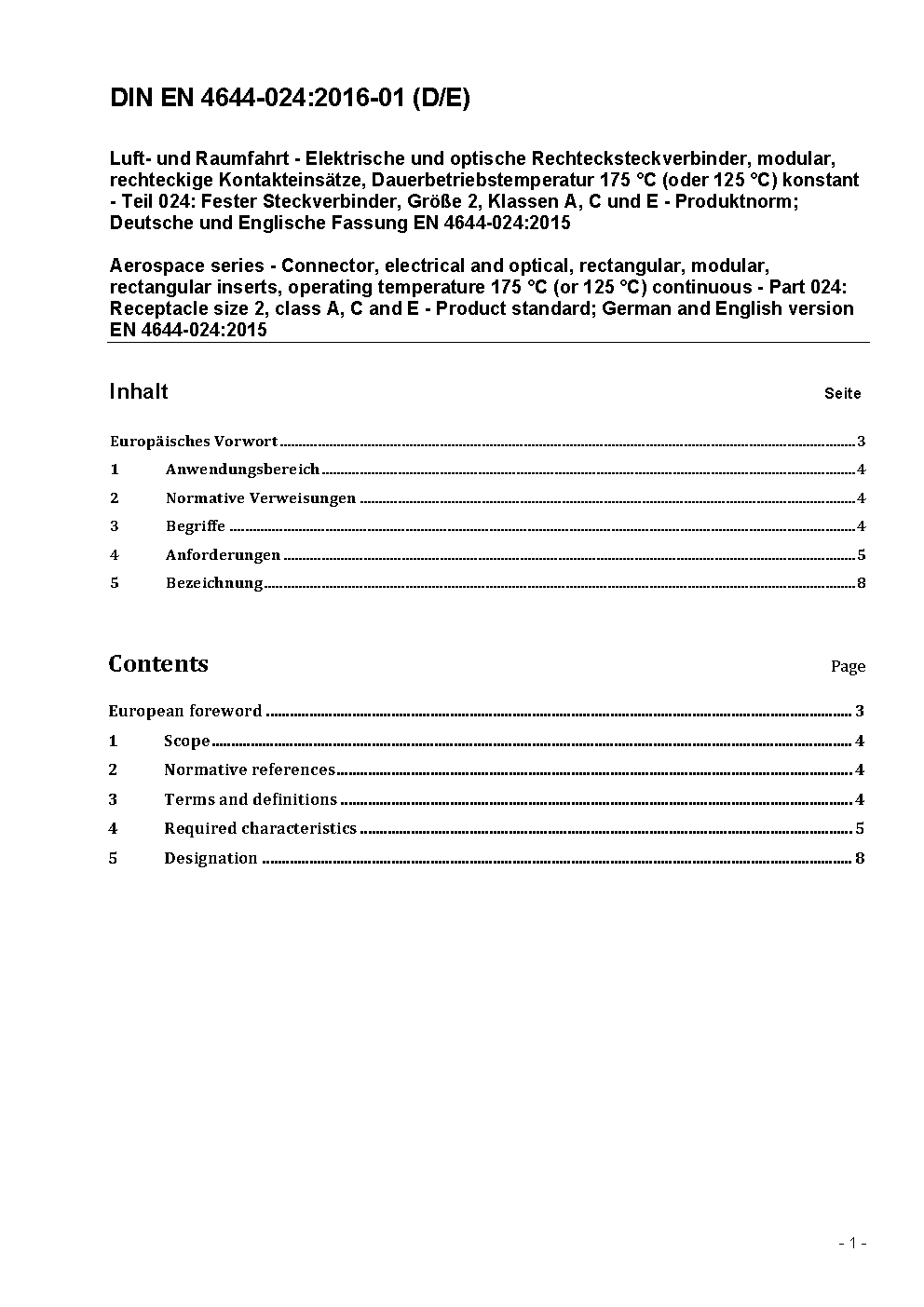 Luft- und Raumfahrt - Elektrische und optische Rechtecksteckverbinder, modular, rechteckige Kontakteinsätze, Dauerbetriebstemperatur 175 °C (oder 125 °C) konstant - Teil 024: Fester Steckverbinder, Größe 2, Klassen A, C und E - Produktnorm; Deutsche und Englische Fassung EN 4644-024:2015