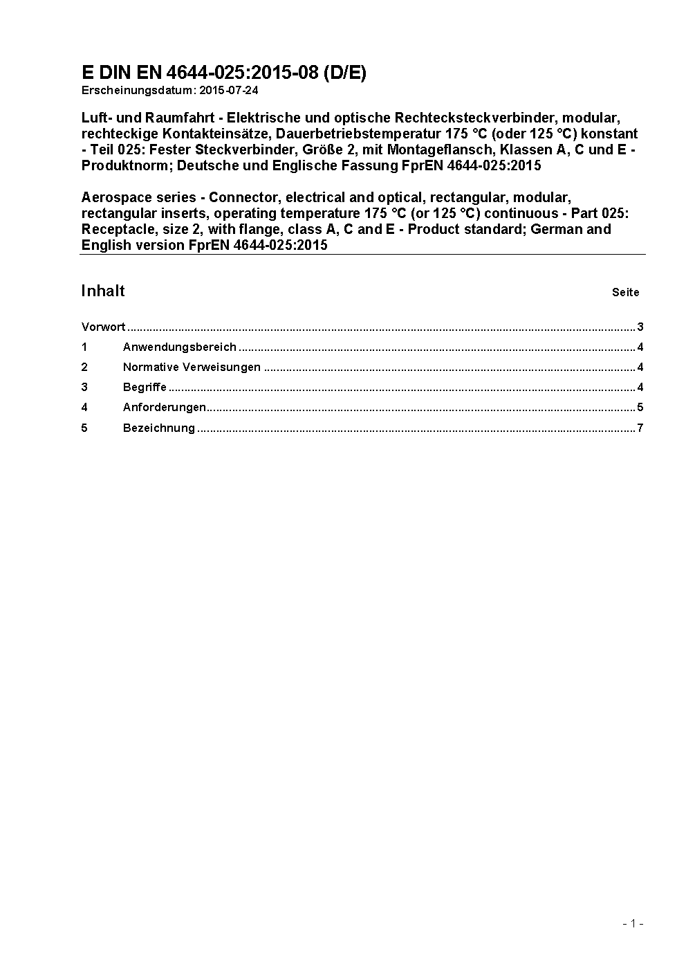 Luft- und Raumfahrt - Elektrische und optische Rechtecksteckverbinder, modular, rechteckige Kontakteinsätze, Dauerbetriebstemperatur 175 °C (oder 125 °C) konstant - Teil 025: Fester Steckverbinder, Größe 2, mit Montageflansch, Klassen A, C und E - Produktnorm; Deutsche und Englische Fassung EN 4644-025:2015
