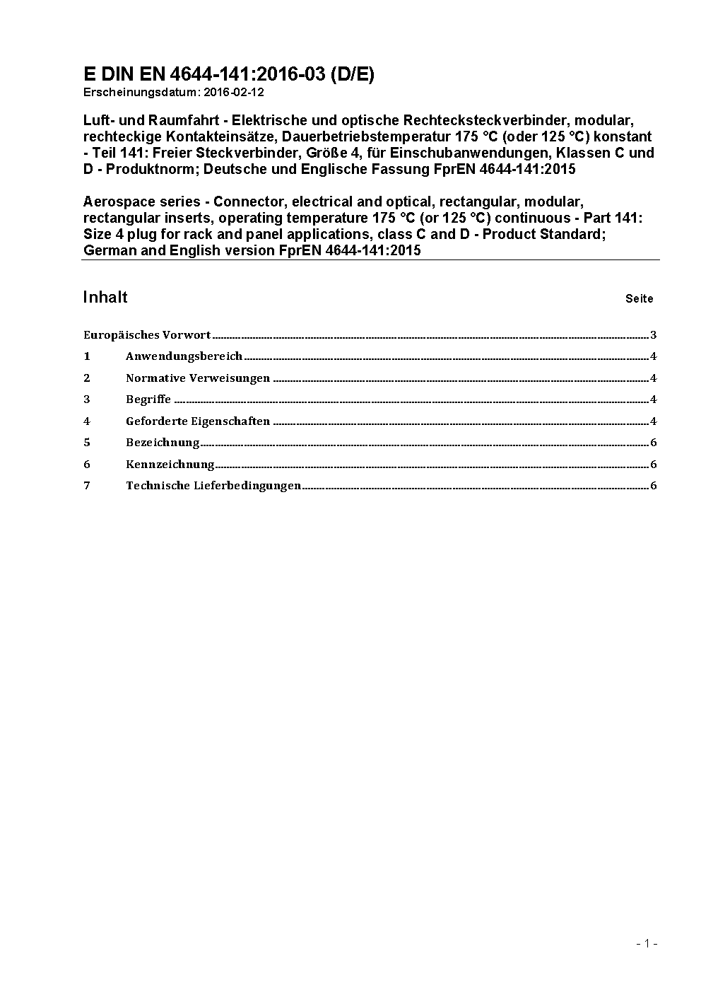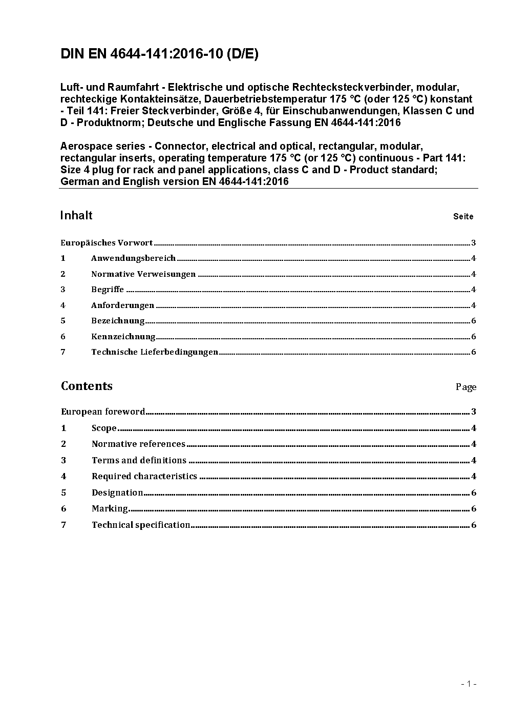 Luft- und Raumfahrt - Elektrische und optische Rechtecksteckverbinder, modular, rechteckige Kontakteinsätze, Dauerbetriebstemperatur 175 °C (oder 125 °C) konstant - Teil 141: Freier Steckverbinder, Größe 4, für Einschubanwendungen, Klassen C und D - Produktnorm; Deutsche und Englische Fassung EN 4644-141:2016