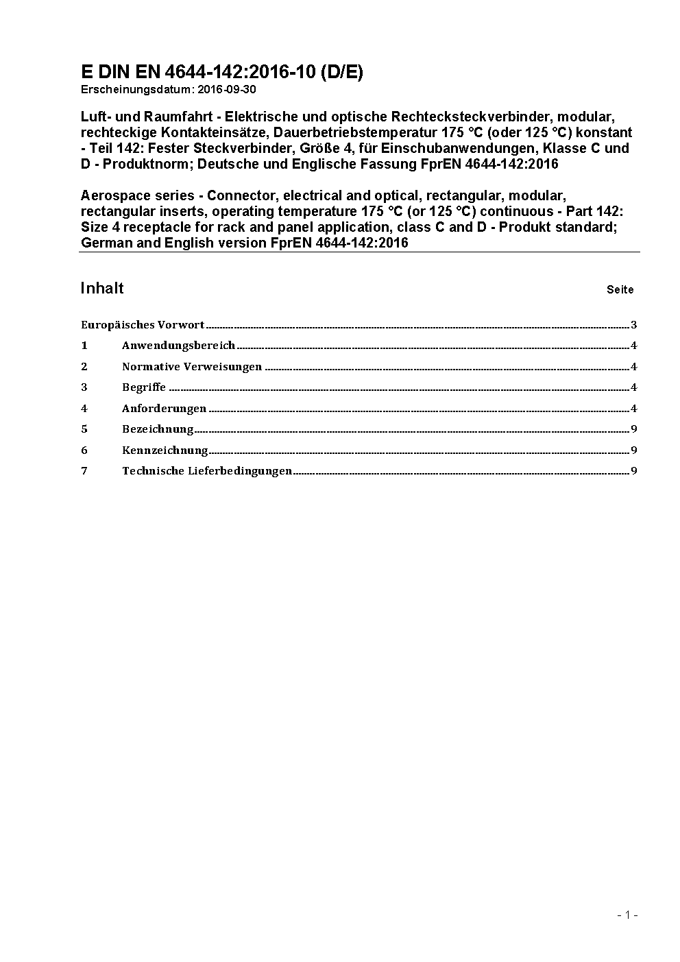 Luft- und Raumfahrt - Elektrische und optische Rechtecksteckverbinder, modular, rechteckige Kontakteinsätze, Dauerbetriebstemperatur 175 °C (oder 125 °C) konstant - Teil 142: Fester Steckverbinder, Größe 4, für Einschubanwendungen - Produktnorm; Deutsche und Englische Fassung EN 4644-142:2012