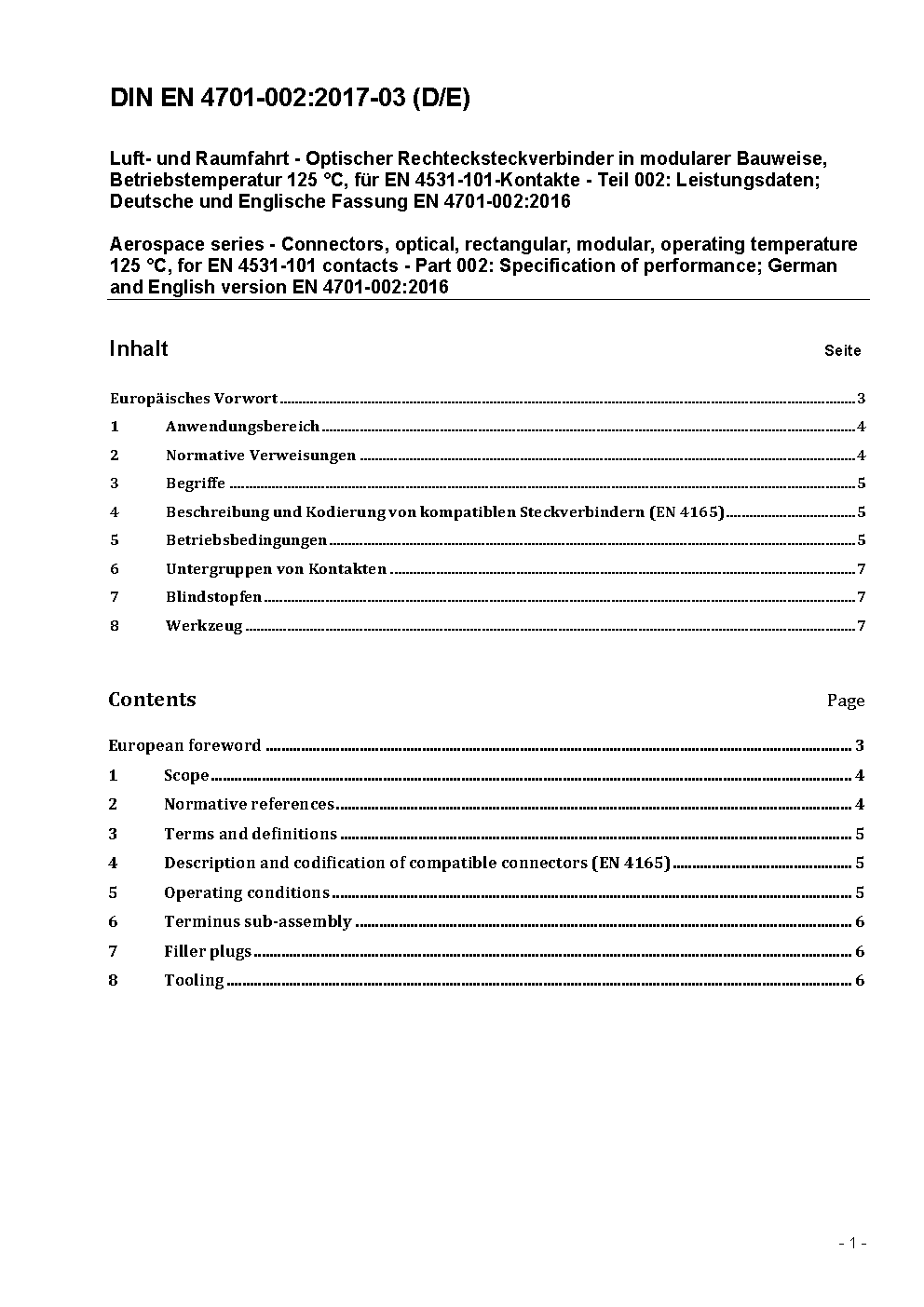 Aerospace series - Connectors, optical, rectangular, modular, operating temperature 125 °C, for EN 4531-101 contacts - Part 002: Specification of performance; German and English version EN 4701-002:2016