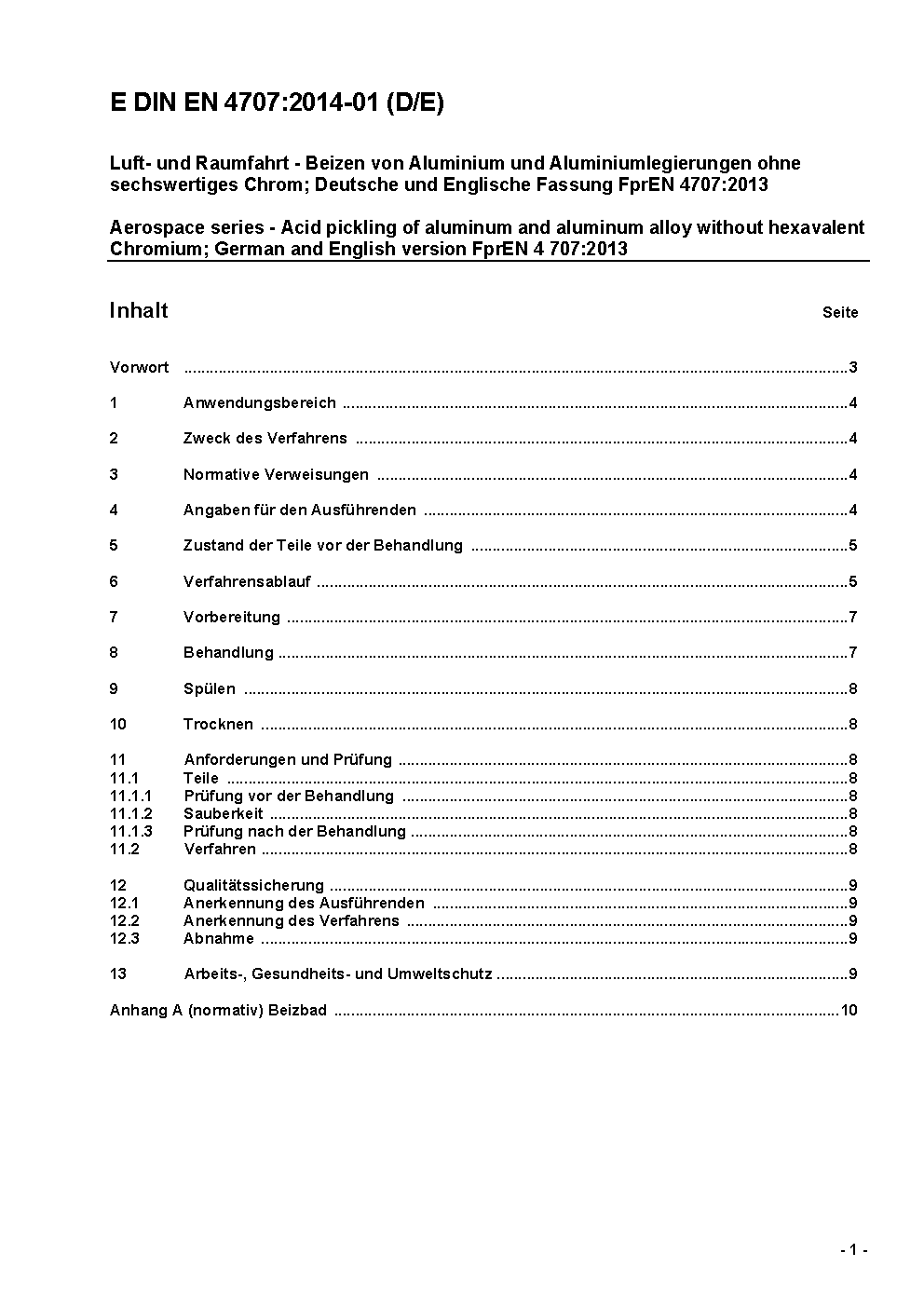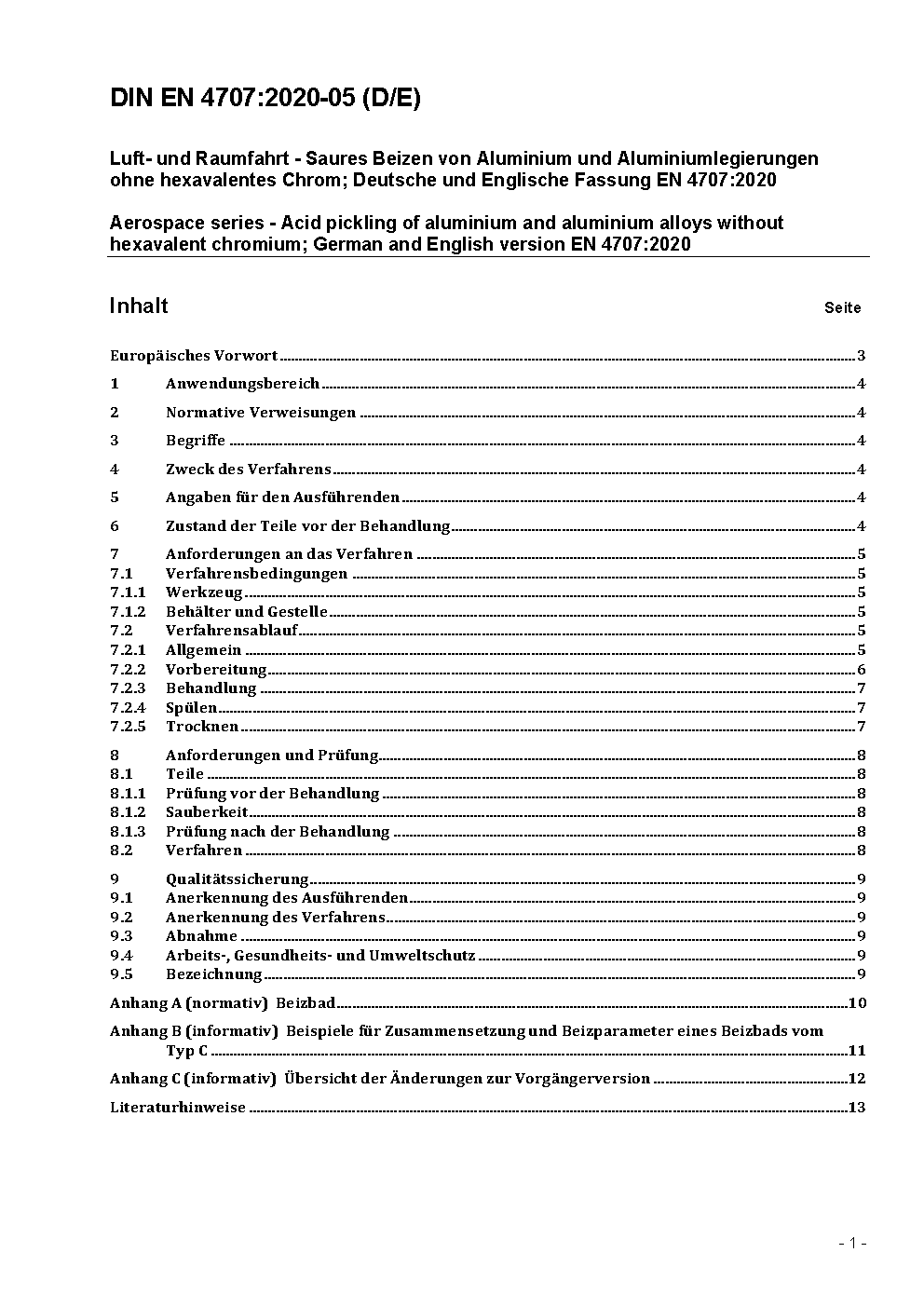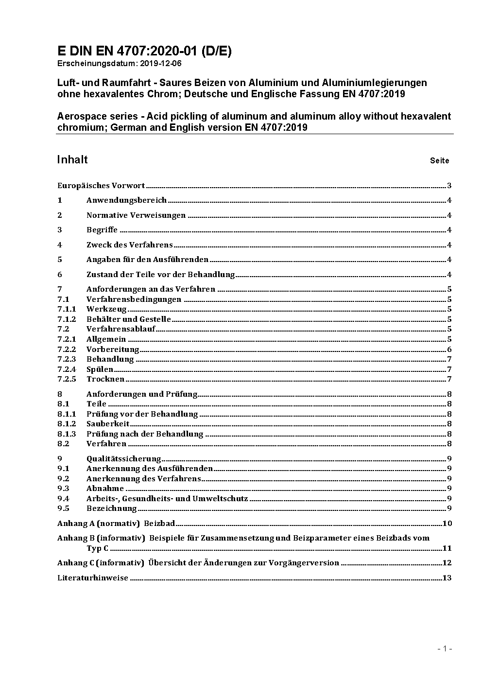 Luft- und Raumfahrt - Saures Beizen von Aluminium und Aluminiumlegierungen ohne hexavalentes Chrom; Deutsche und Englische Fassung EN 4707:2019