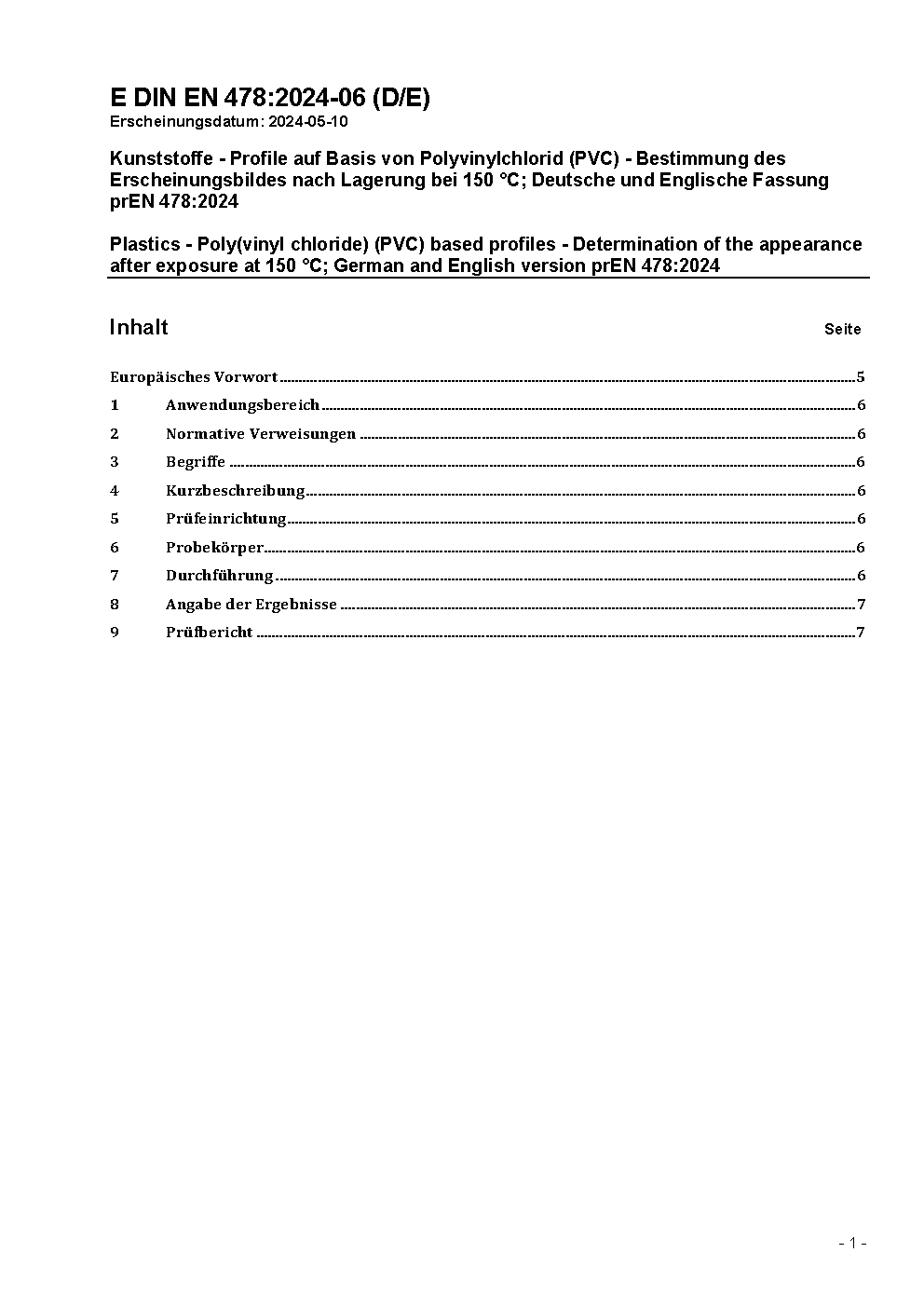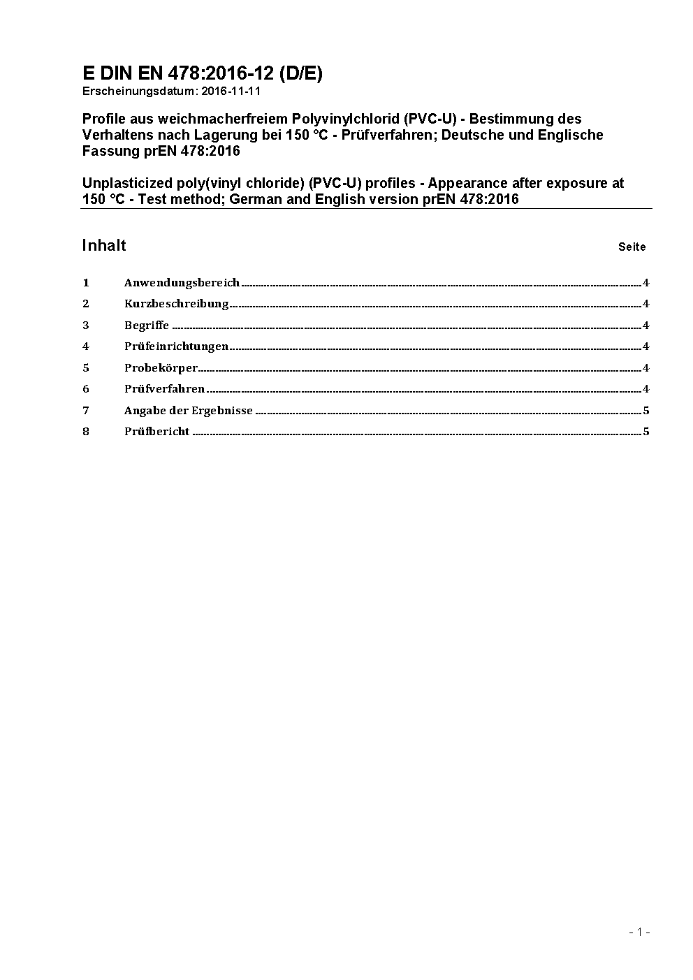 Unplasticized poly(vinyl chloride) (PVC-U) profiles - Appearance after exposure at 150 °C - Test method; German and English version prEN 478:2016