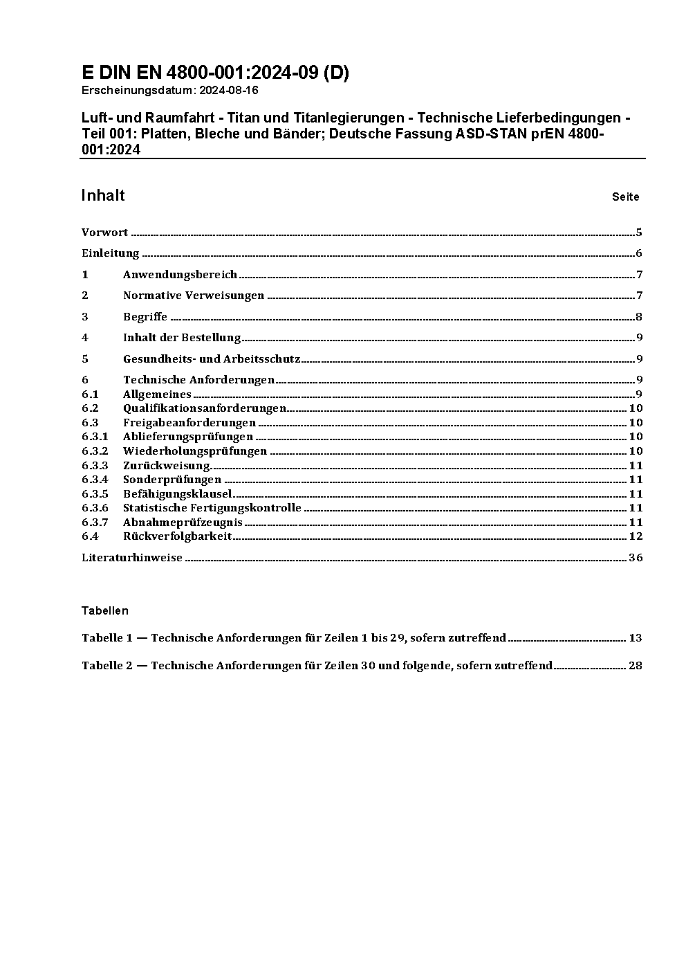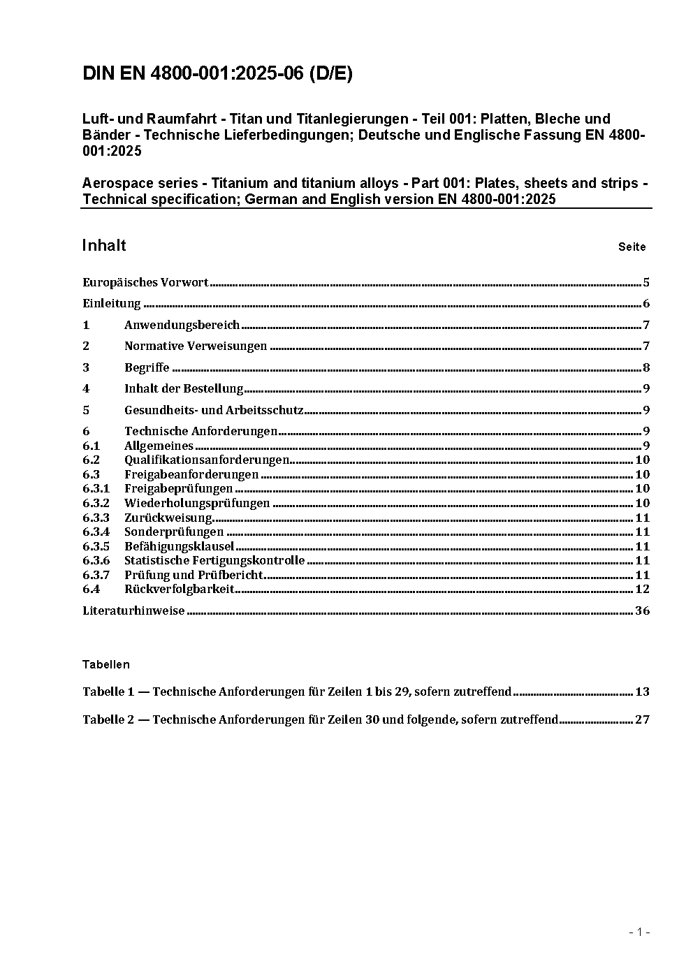 Luft- und Raumfahrt - Titan und Titanlegierungen - Technische Lieferbedingungen - Teil 001: Platten, Bleche und Bänder; Deutsche und Englische Fassung EN 4800-001:2010