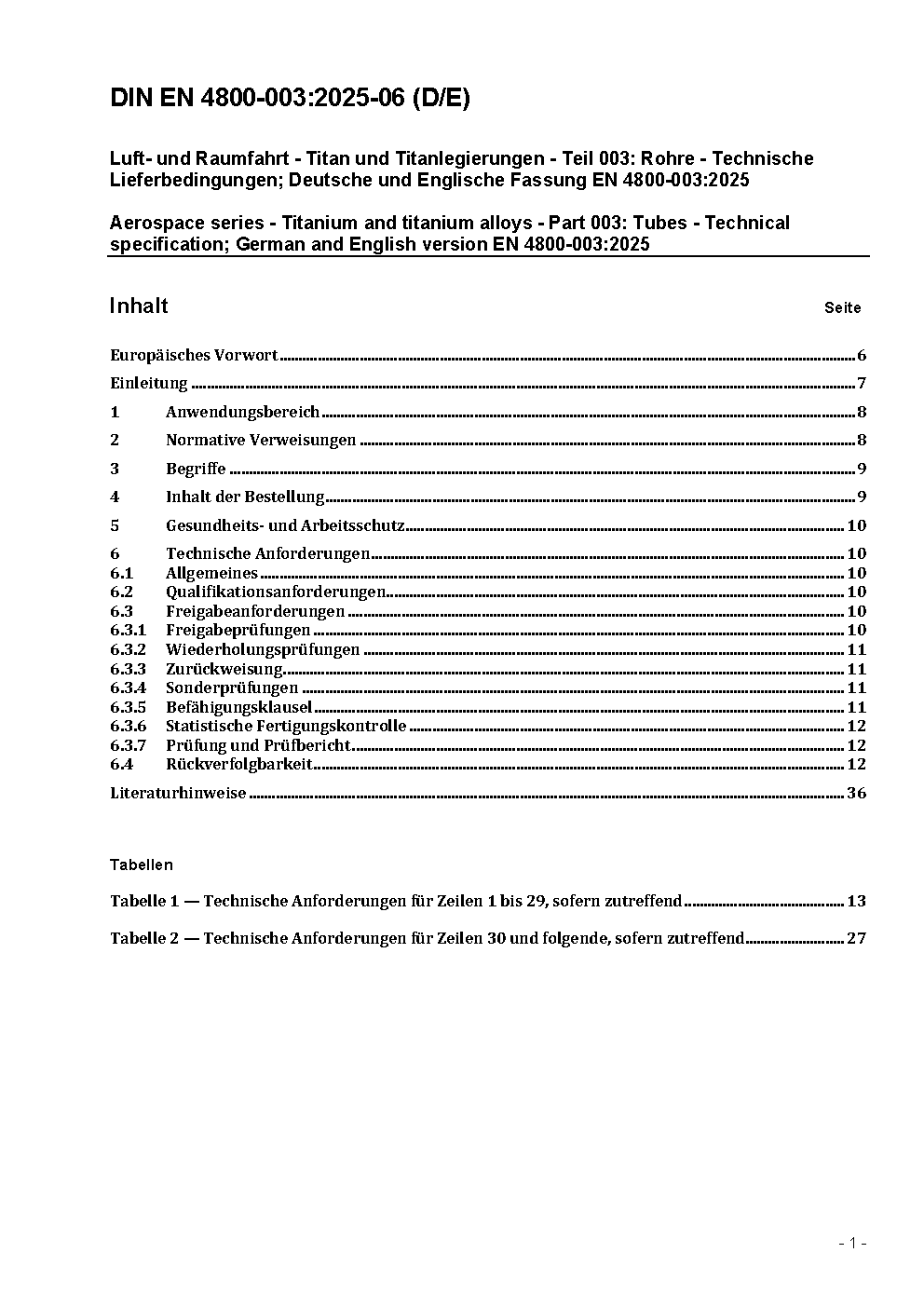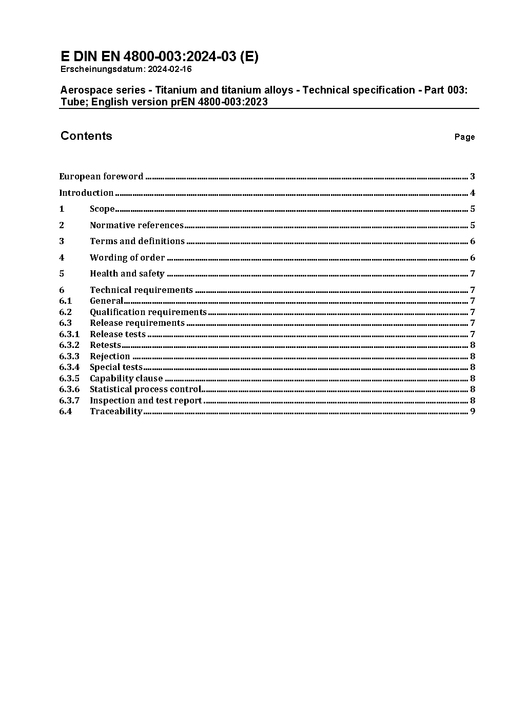 Luft- und Raumfahrt - Titan und Titanlegierungen, Kneterzeugnisse - Technische Lieferbedingungen - Teil 003: Rohre; Deutsche und Englische Fassung FprEN 4800-003:2009