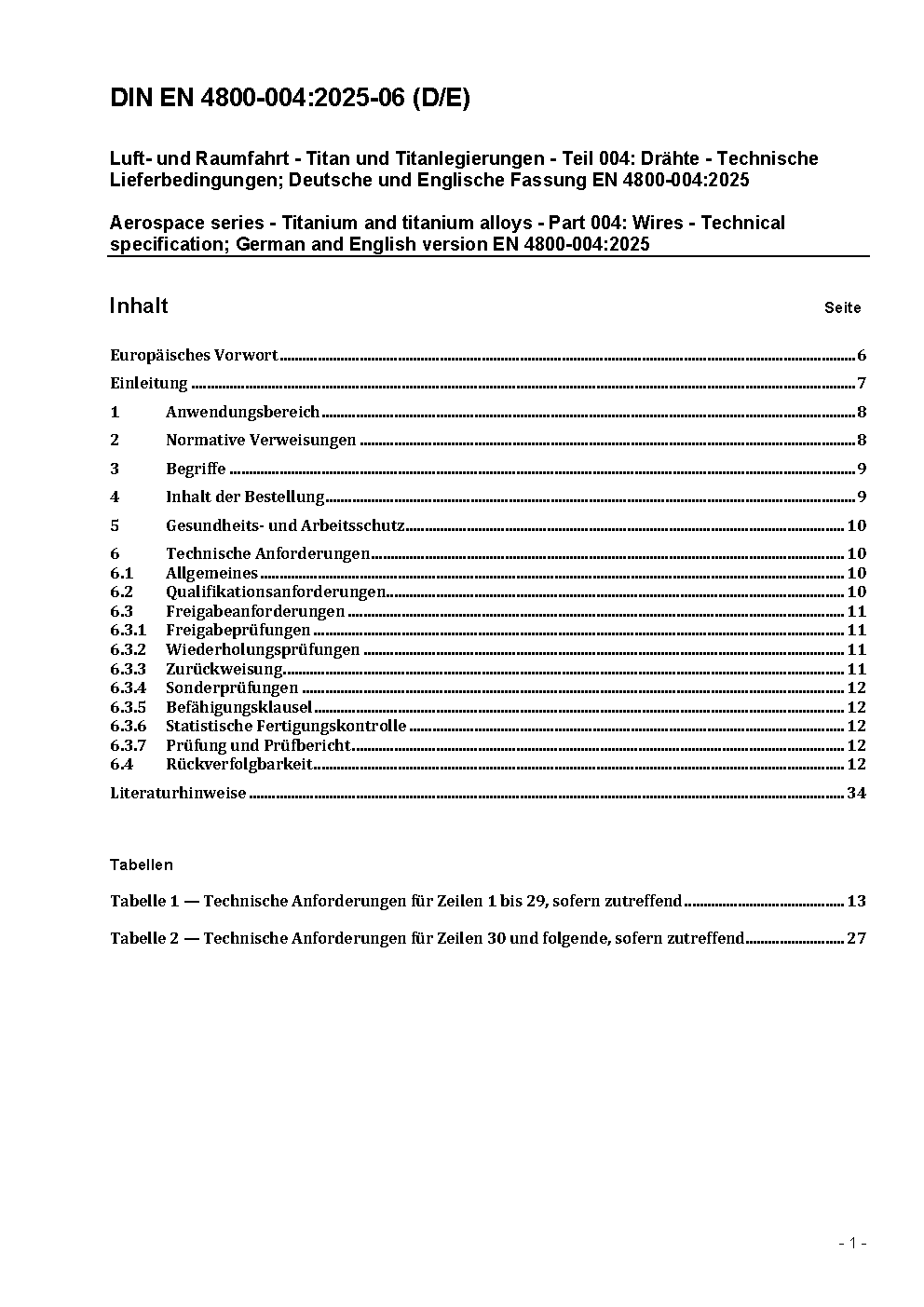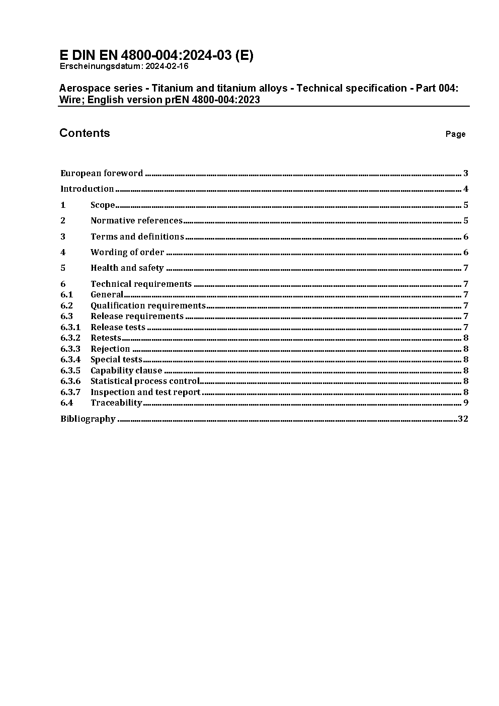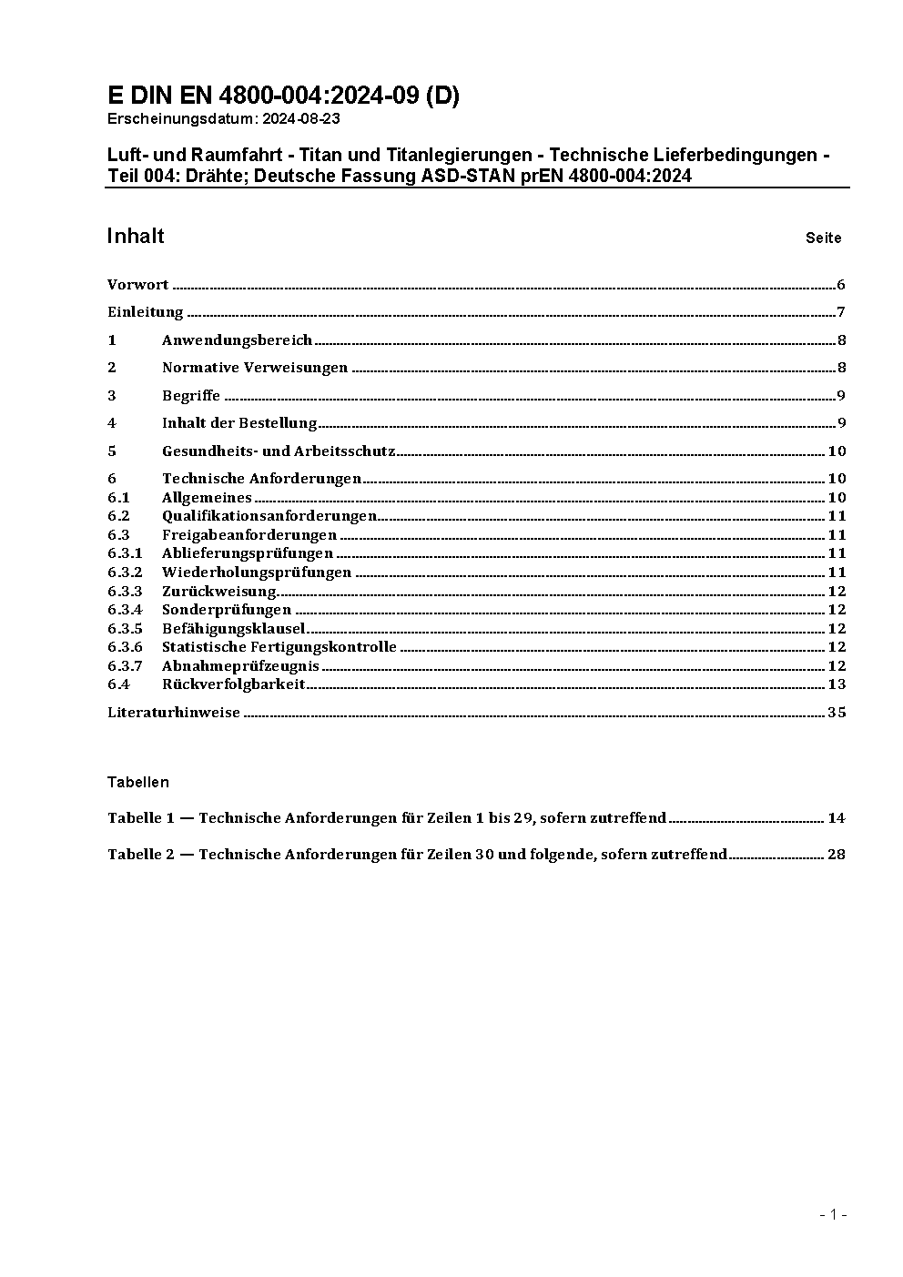Luft- und Raumfahrt - Titan und Titanlegierungen - Technische Lieferbedingungen - Teil 004: Drähte; Deutsche Fassung ASD-STAN prEN 4800-004:2024